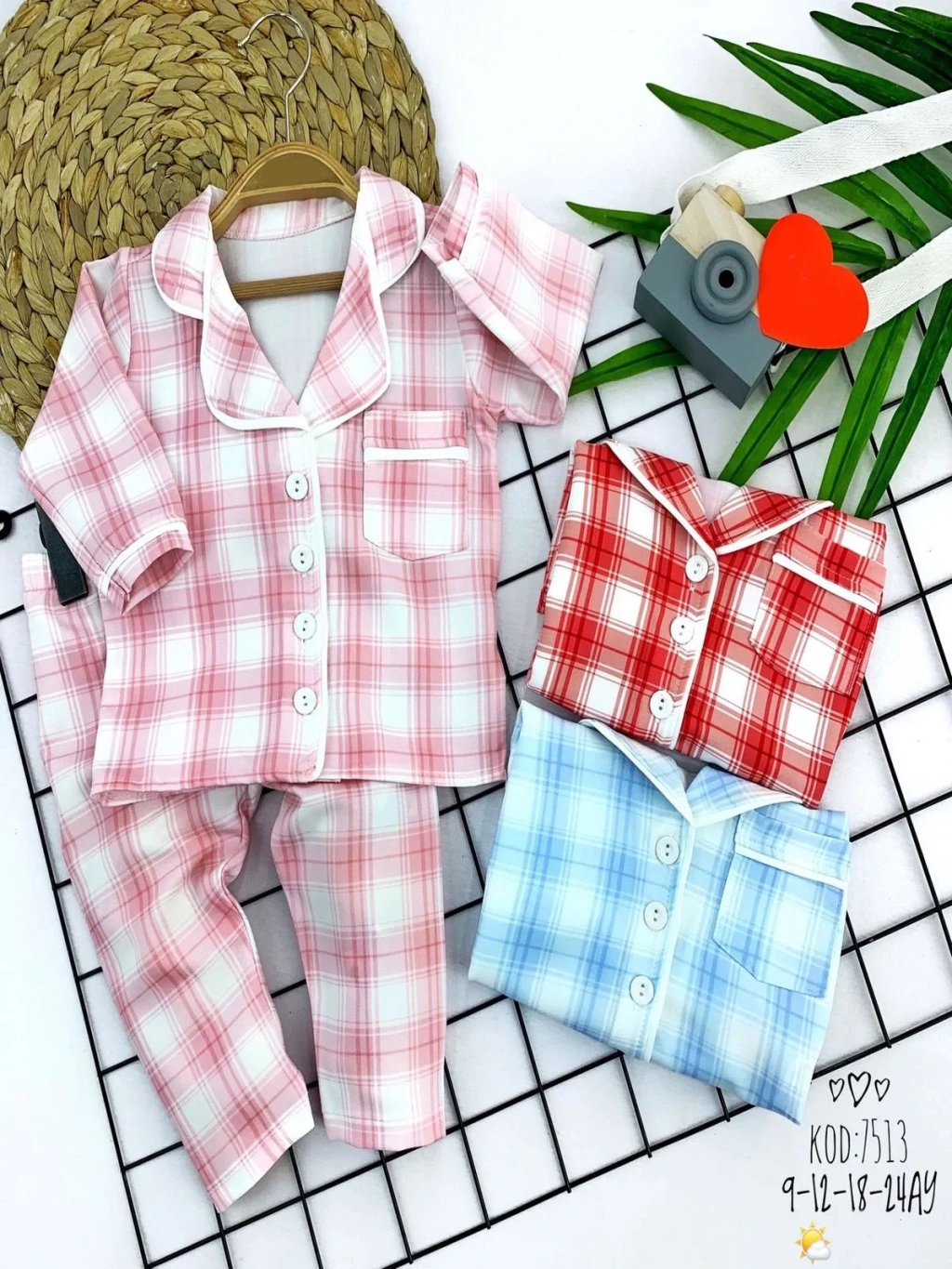 9-12-18-24 Ay Düğme Kapamalı Ekose Desenli 2li Kız Erkek Bebek Pijama Takımı Pembe