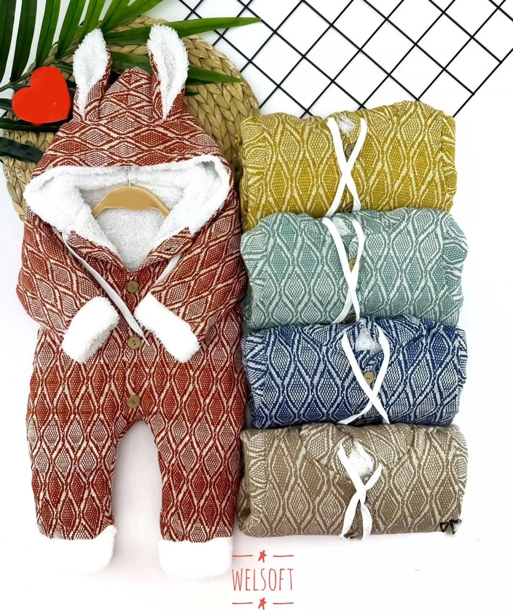 9-12-18-24 Ay Düğme Kapamalı Kulaklı Kapşonlu Motif Desenli Örme Kumaş Kız Erkek Bebek Tulumu Lacivert