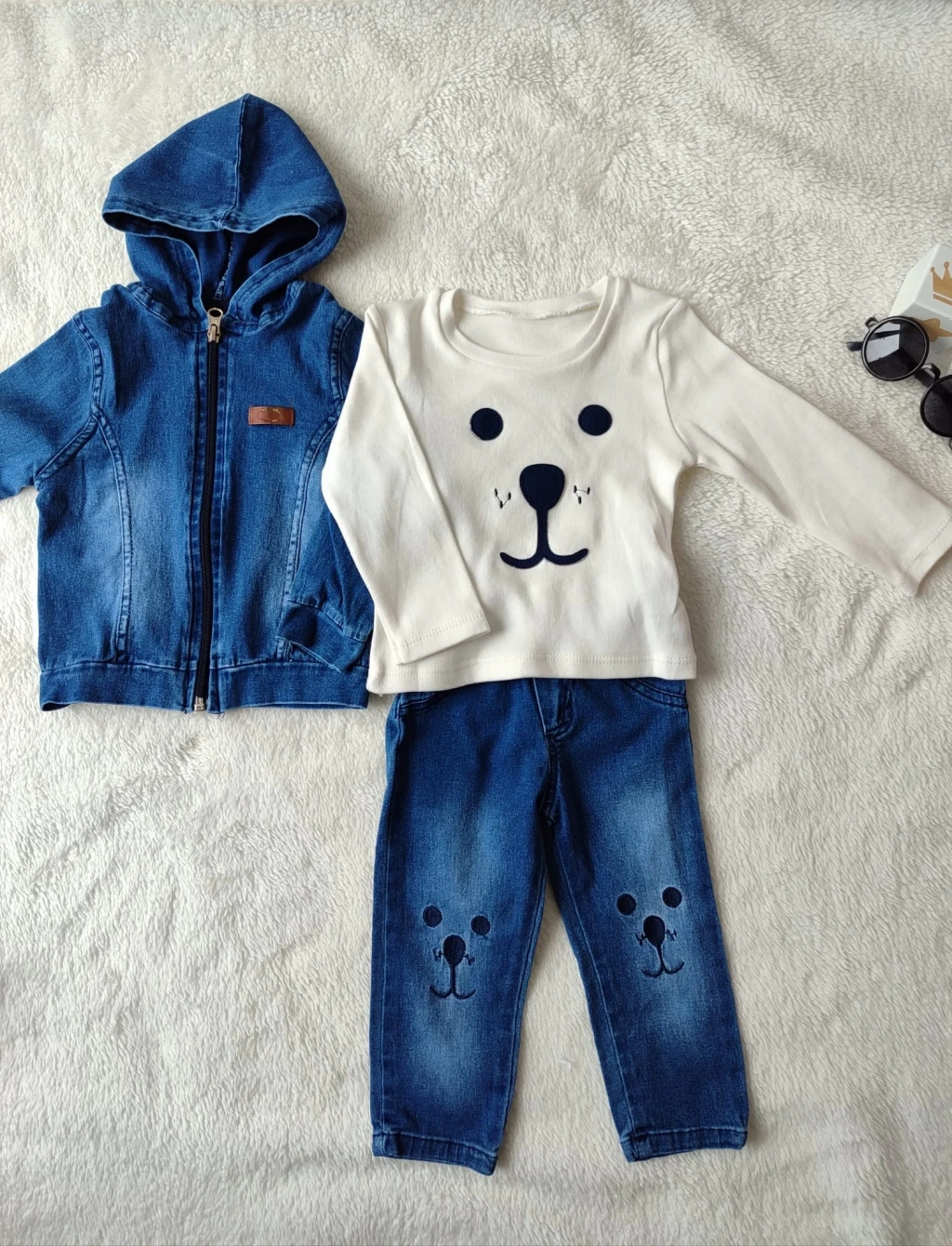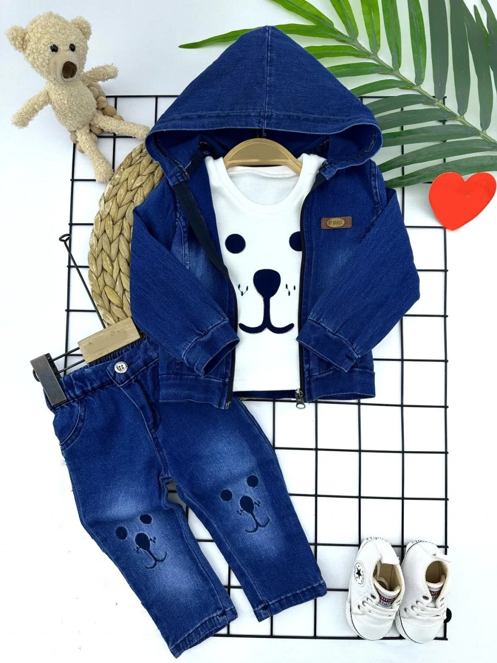 9-12-18-24 Ay Kot Kumaş Kapşonlu Uzun Kol Sweatli Kot Kumaş 3lü Erkek Bebek Takımı Mavi