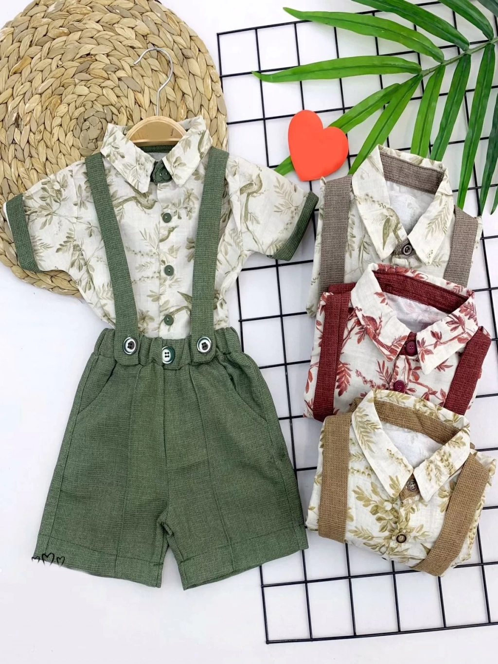 9-12-18-24 Ay Pamuklu Kumaş Keten Kısa Kol Gömlek 2li Erkek Bebek Salopet Takımı Kahverengi