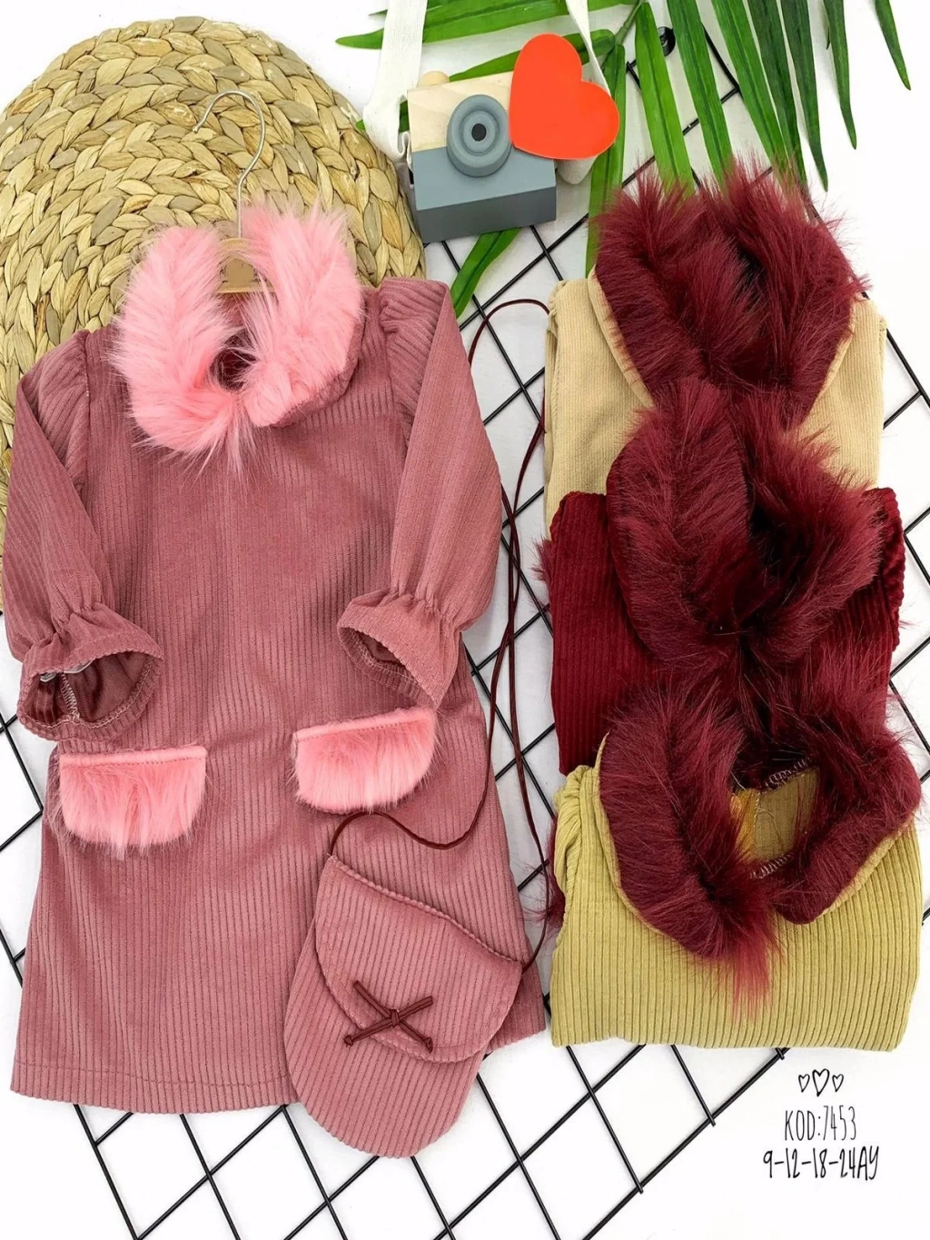 9-12-18-24 Ay Tüylü Yaka Ve Cep Kapaklı Çantalı Fitilli Kadife Uzun Kollu 2li Kız Bebek Elbisesi Bej