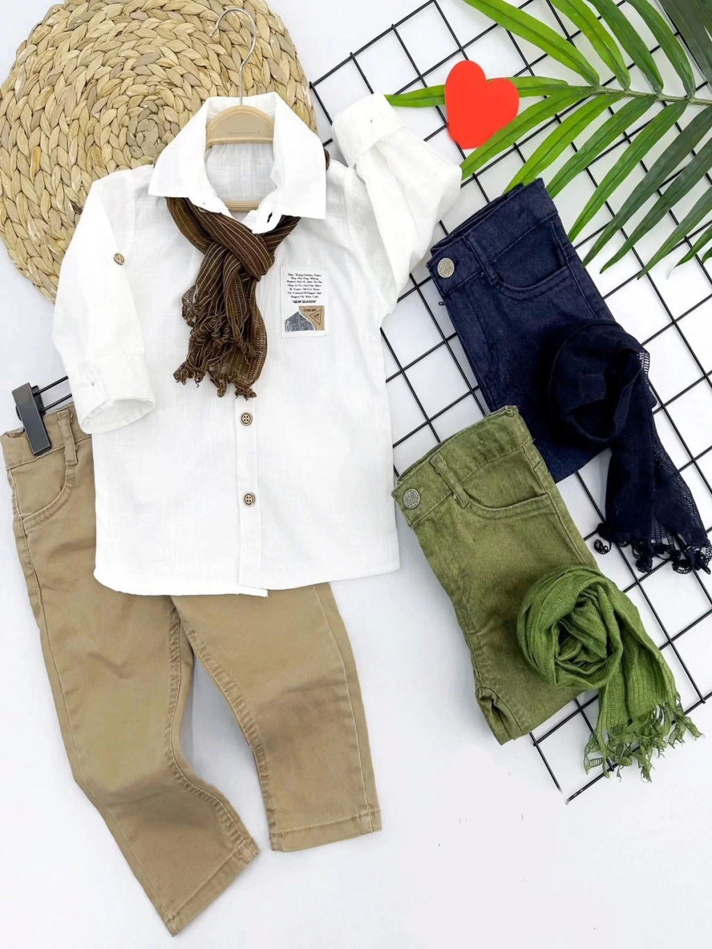 9-12-18-24 Ay Ve 3-4-5 Yaş Fularlı Pamuk Keten Gömlekli Pantolonlu 3lü Erkek Bebek Takımı Bej
