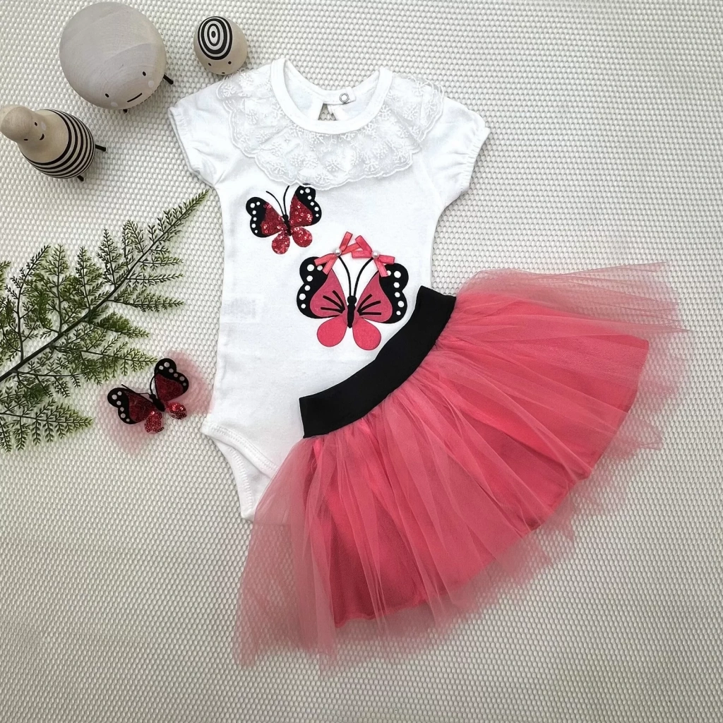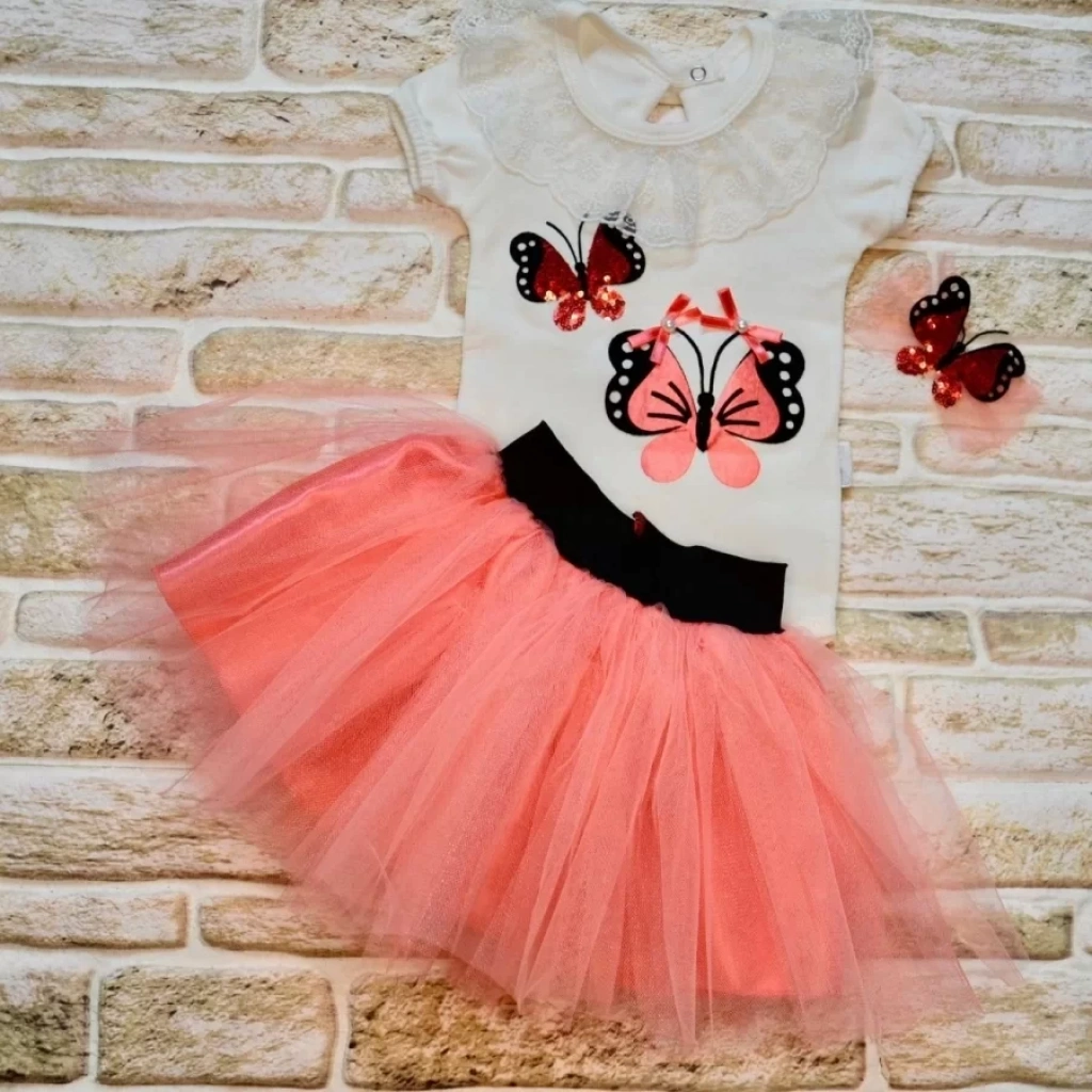 9-12-18 Ay Payetli Kelebek Nakışlı Taçlı Kısa Kollu Tütü Etek 3lü Kız Bebek Takımı Nar Çiçeği
