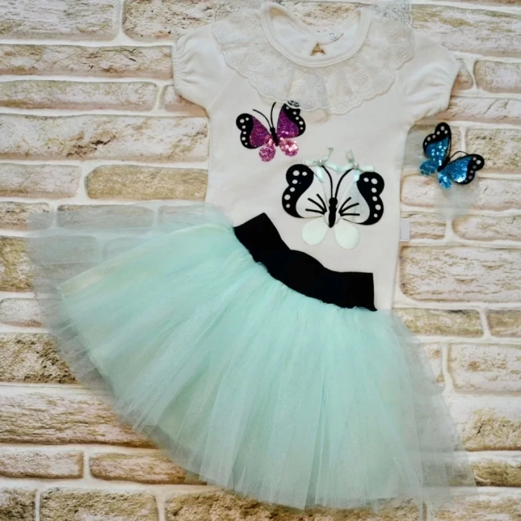 9-12-18 Ay Payetli Kelebek Nakışlı Taçlı Kısa Kollu Tütü Etek 3lü Kız Bebek Takımı Su Yeşili