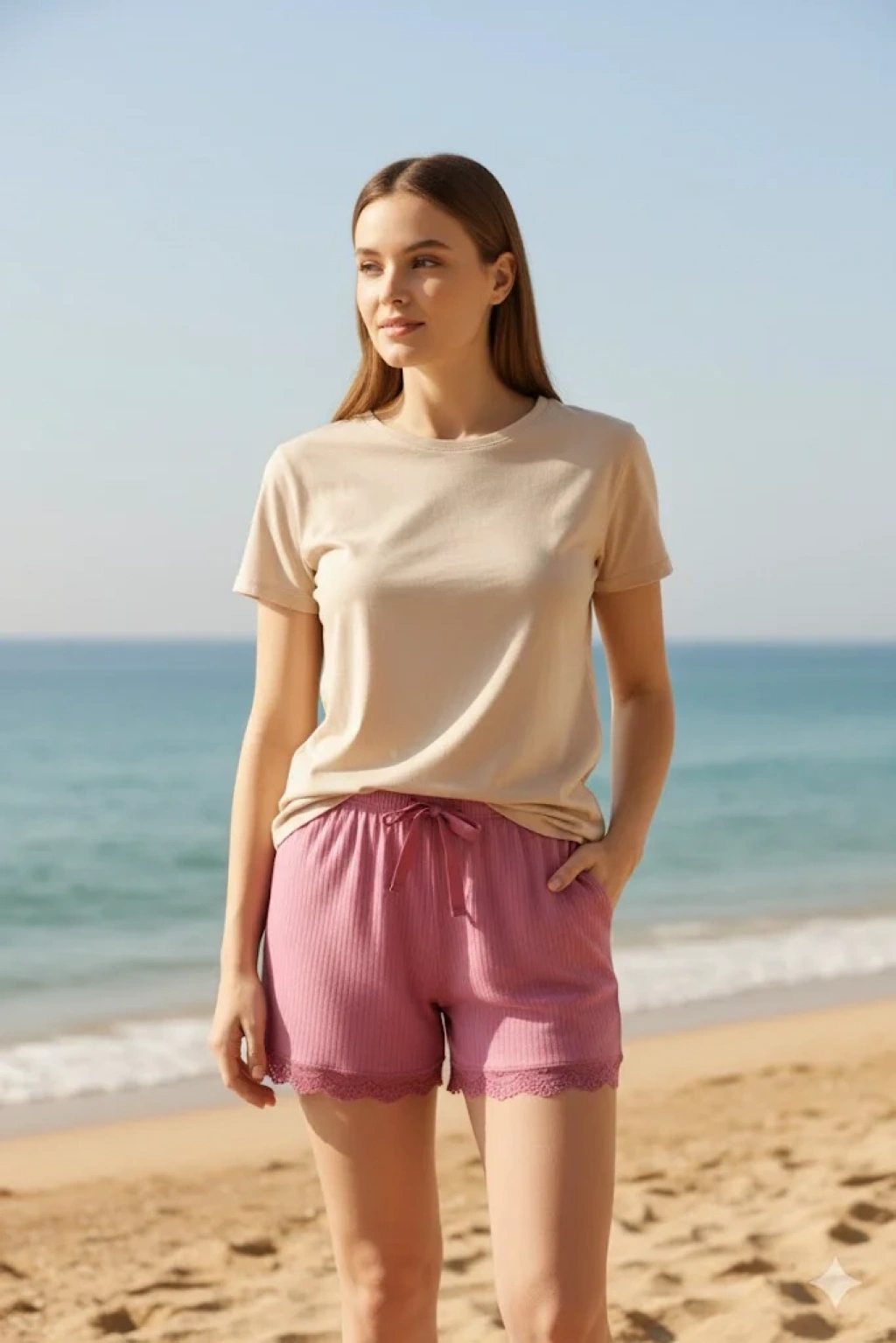 Bambu Fitilli Kadın Ev Şortu Bacak Dantel Detaylı Ev Giyim Taba