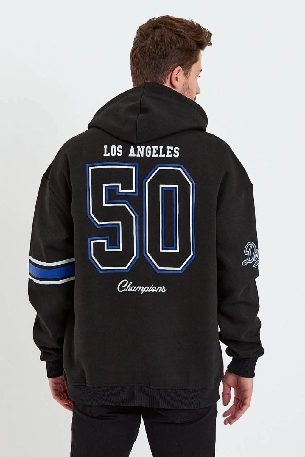 Baskılı Kapşonlu Üç iplik Oversize Sweatshirt - Siyah