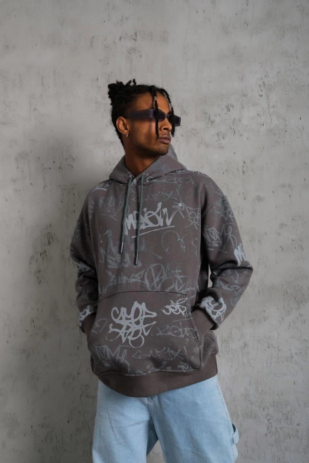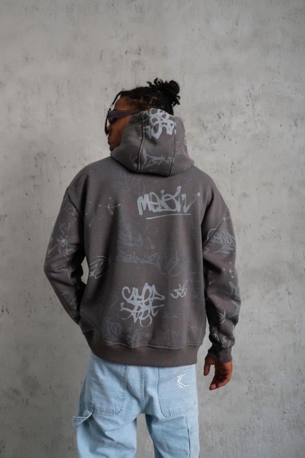 Baskılı Kapüşonlu Ribanalı Sweat - Gri
