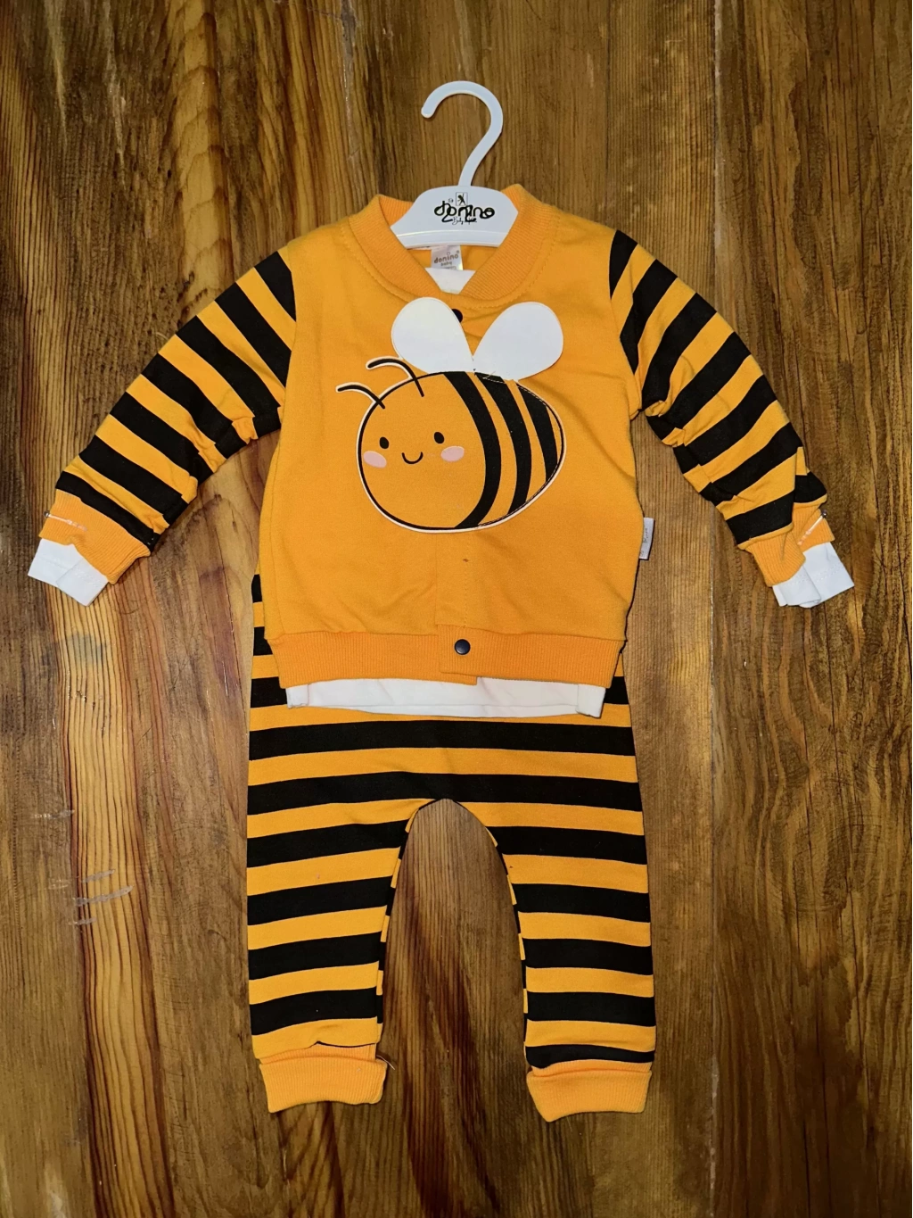 Sarı ve siyah renklerin uyumuyla dikkat çeken bu takım, kaliteli kumaşı sayesinde bebeğin cildine zarar vermeden şık bir görünüm sunar.