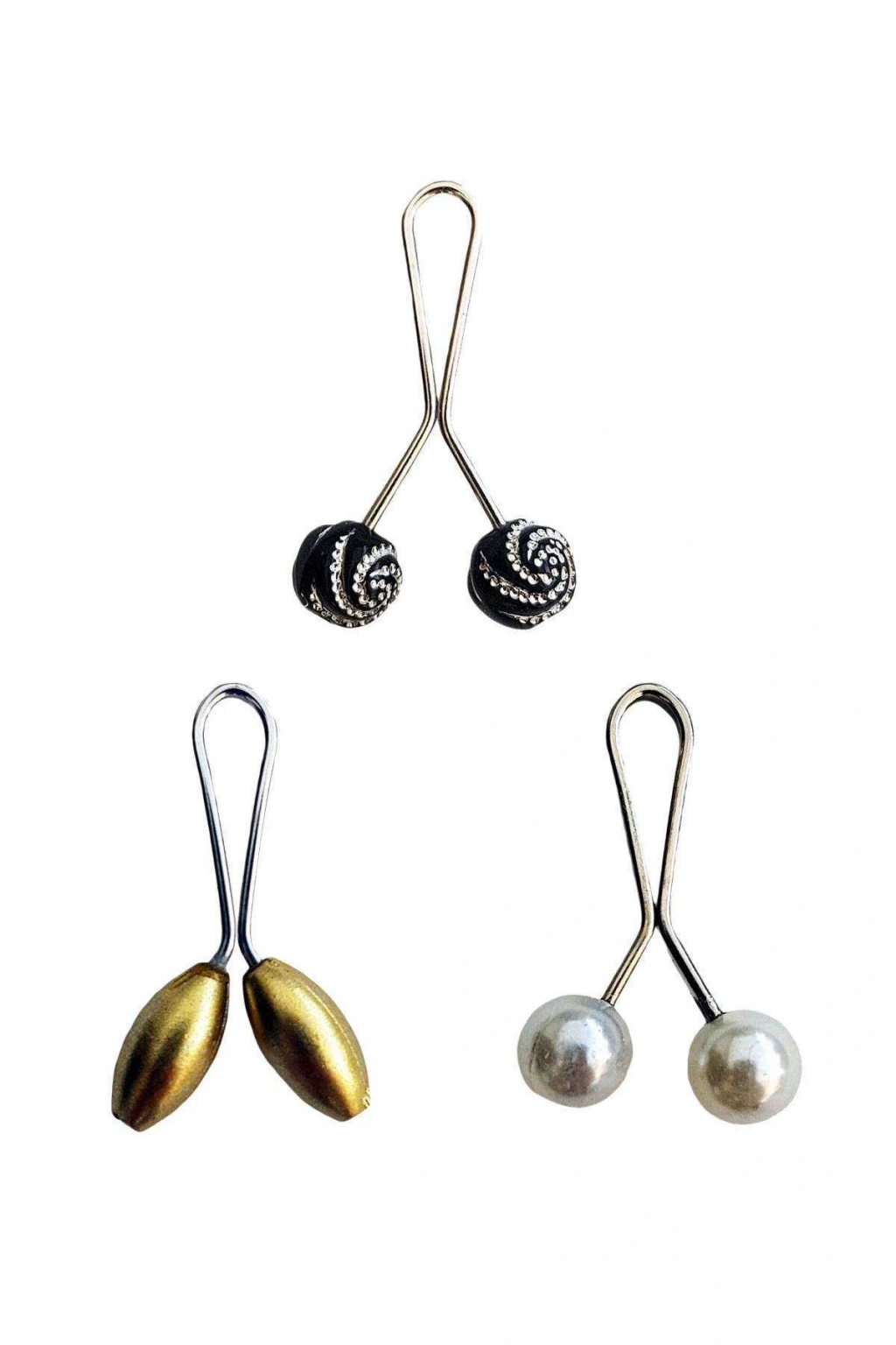 3 Adet Tesettür Eşarp ve Şal Klipsi Sarı İnci Beyaz Siyah Desenli Tesettür giyimde şıklığınızı tamamlayacak şal ve eşarp klipsleri, sıkı tutan kıskacı sayesinde baş örtüsü şal ve eşarplarınızda kaymayı önleyerek şık bir görüntü kazandıracak. Seyahatte ofiste günlük ve iş ortamında hızlı ve pratik kullanım sağlar. Şal ve eşarbınızı zedelemez. Sıkı tutar.