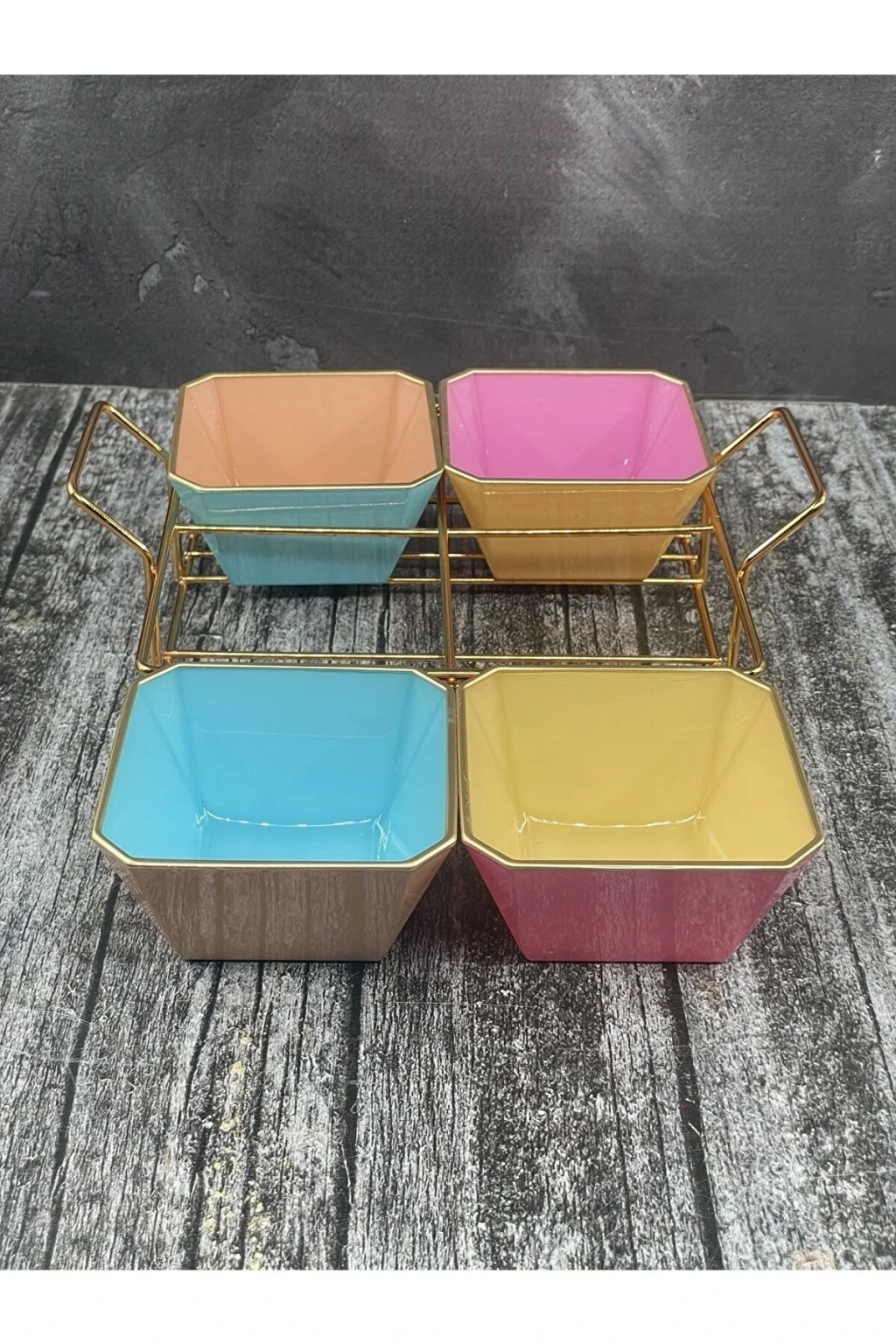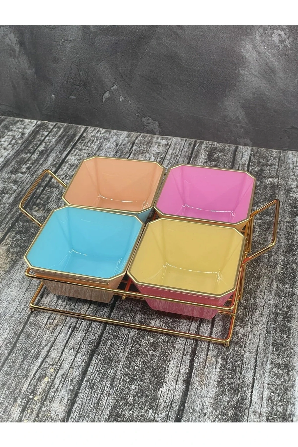biçomi 4 Bölmeli Gold Standlı Cam Kahvaltılık Çerezlik Sunumluk Renkli