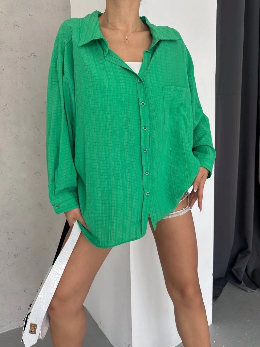 KAZAX marka ağaç kabuğu desenli oversize gömlek, şıklık ve rahatlığı bir arada sunuyor.