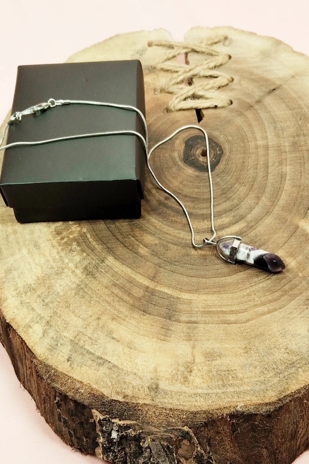 Ametist Doğal Taşı Zincirli El Yapımı Tasarımlı Kolye Uç: 3,5 cm Zincir: 20 cm Kutulu