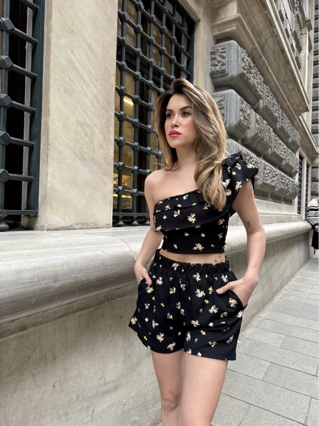 Yeni sezonun trend parçalarından olan baskılı fırfırlı şortlu takım, şıklığı ve rahatlığı bir arada sunuyor.