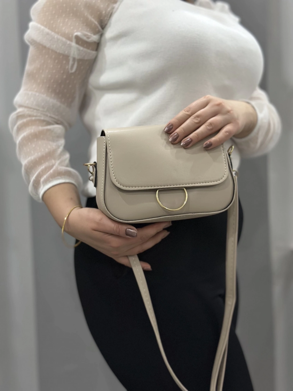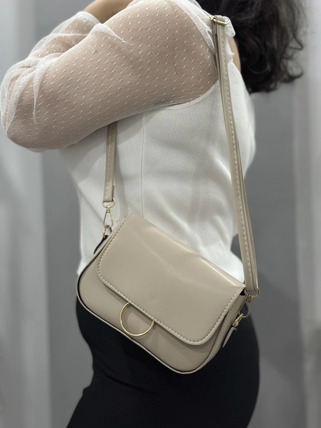 Bej cilt mossi çanta şıklığı ve kullanışlılığı bir arada sunar.