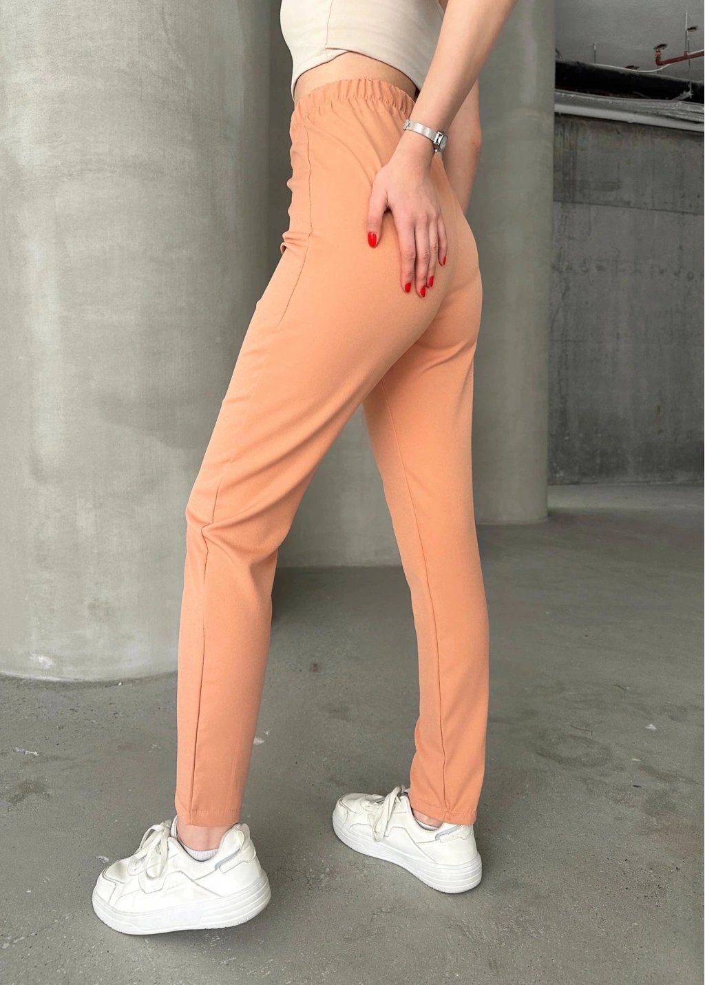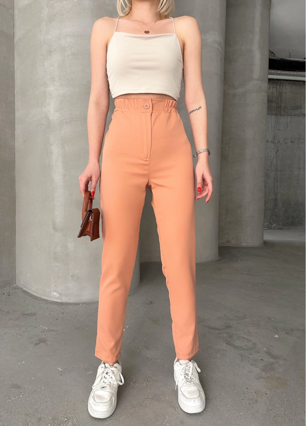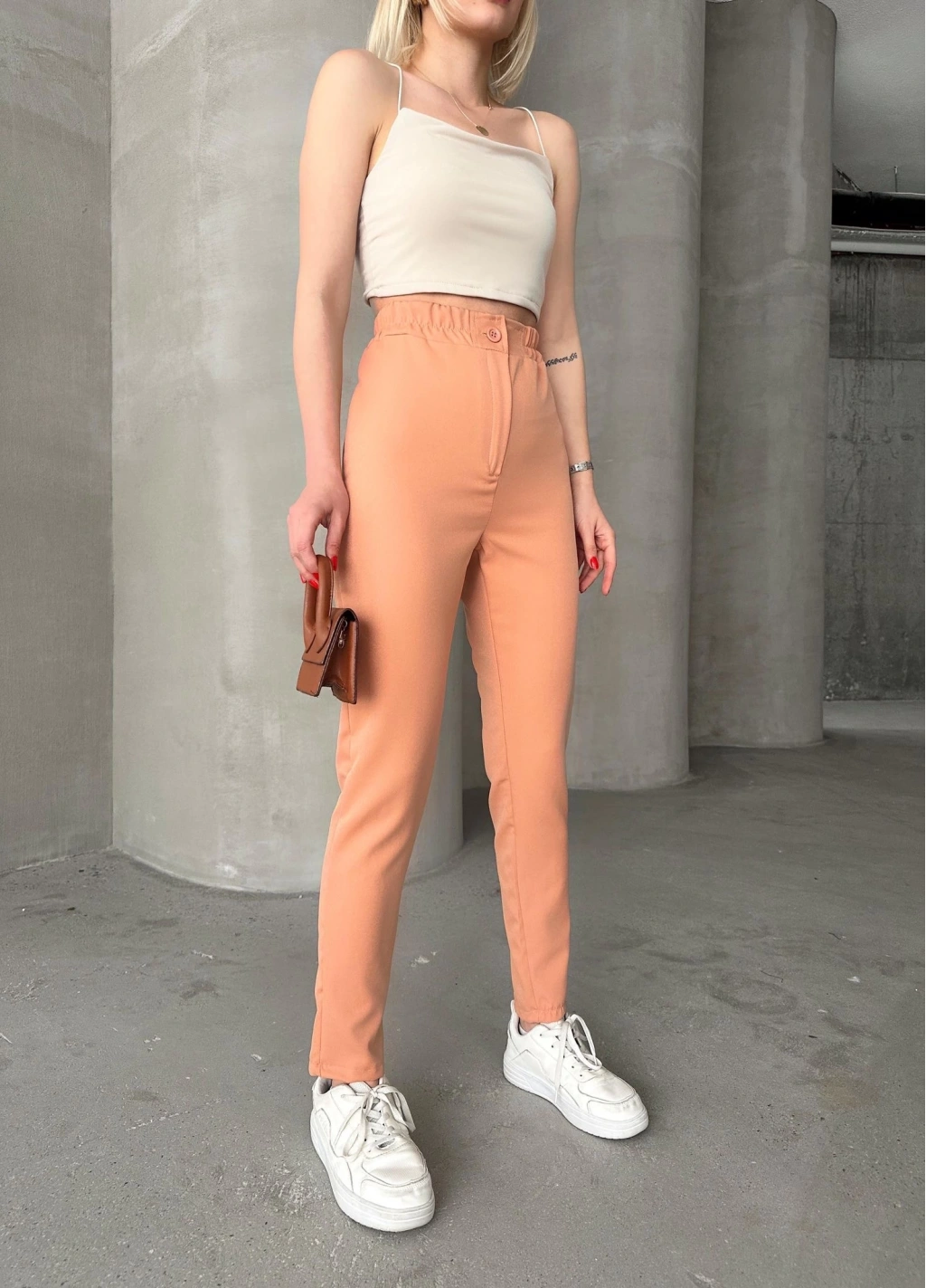 Beli lastikli karamel pantolon, hem şık hem de rahat bir seçenektir.