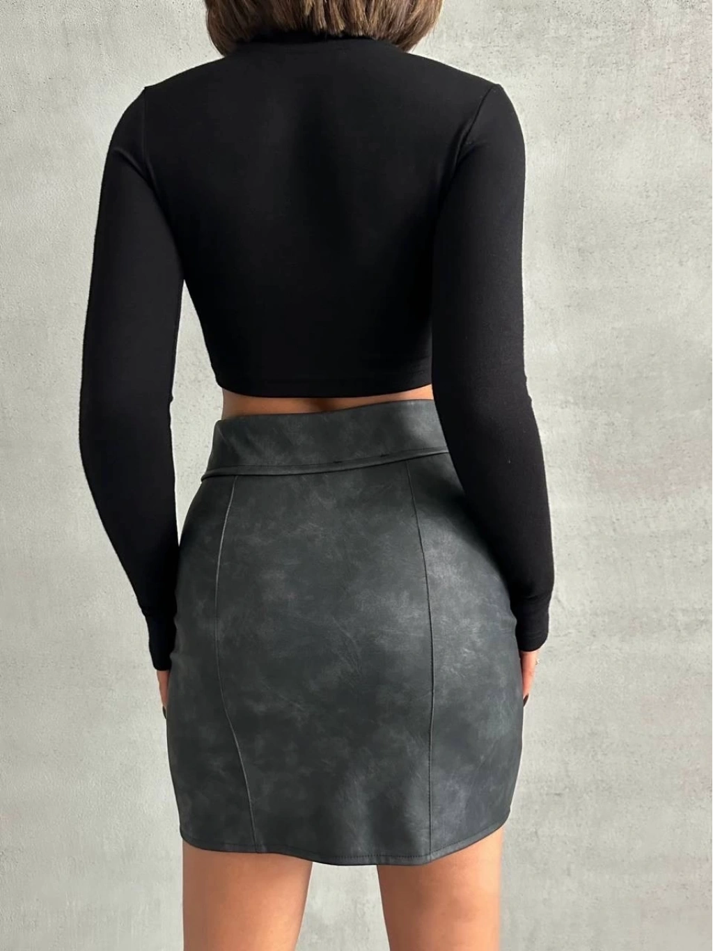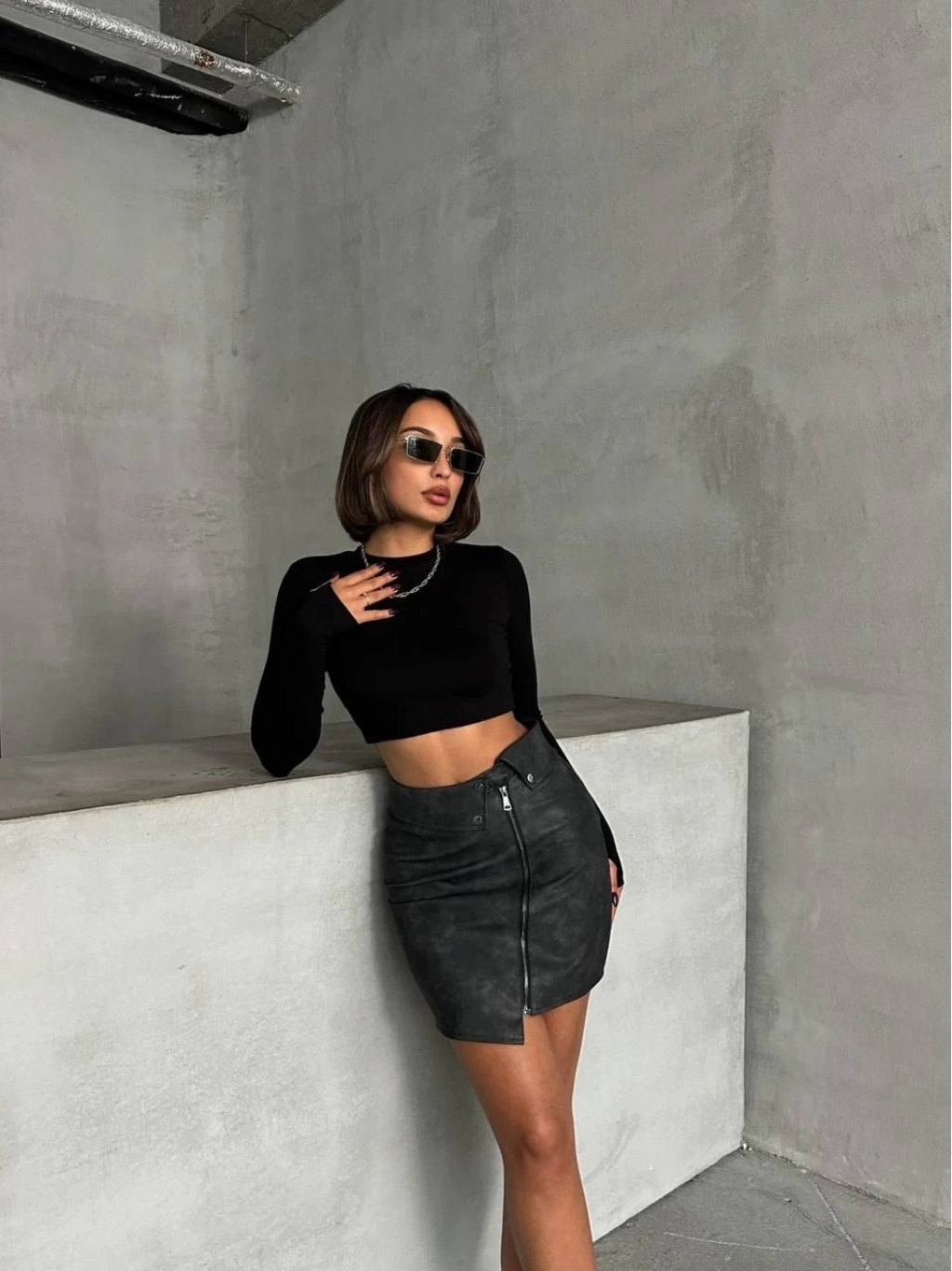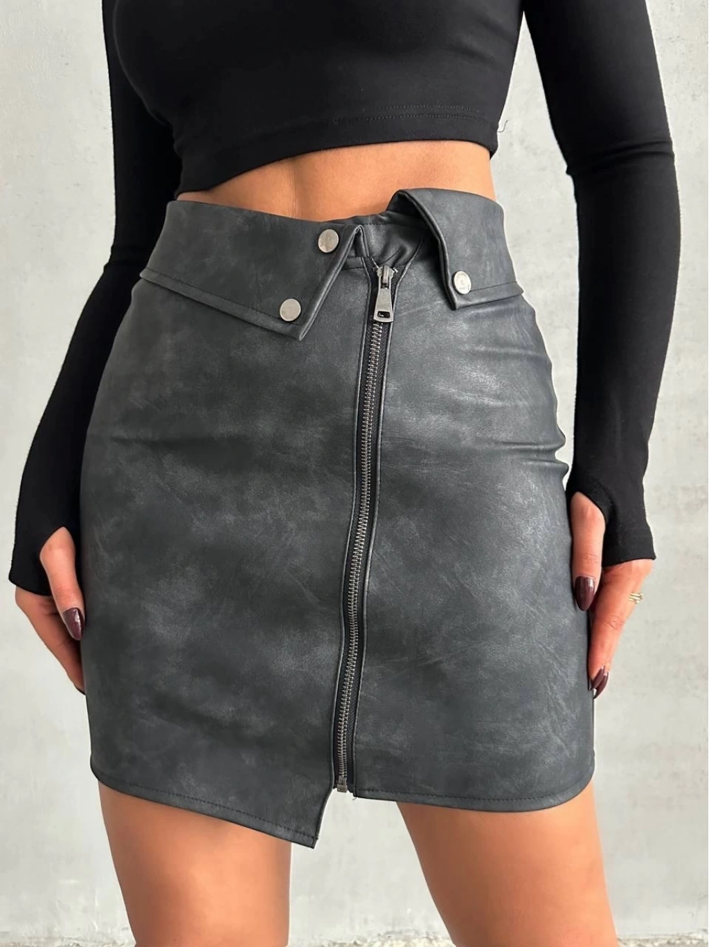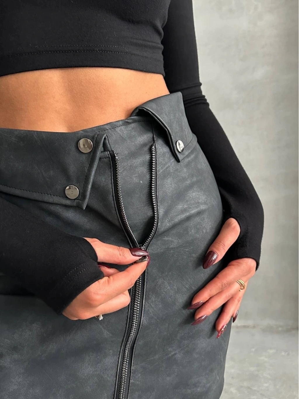Beli pervazlı fermuarlı eskitme deri etek, şıklık ve tarz arayan kadınların favorisi olmaya aday bir parçadır.