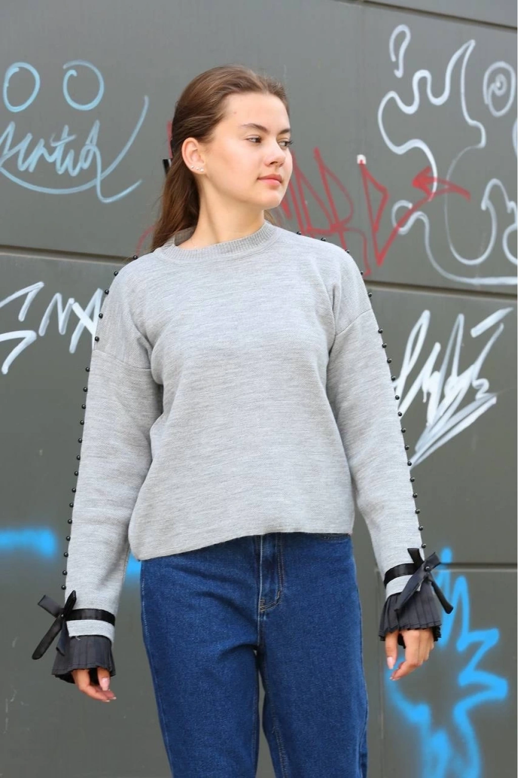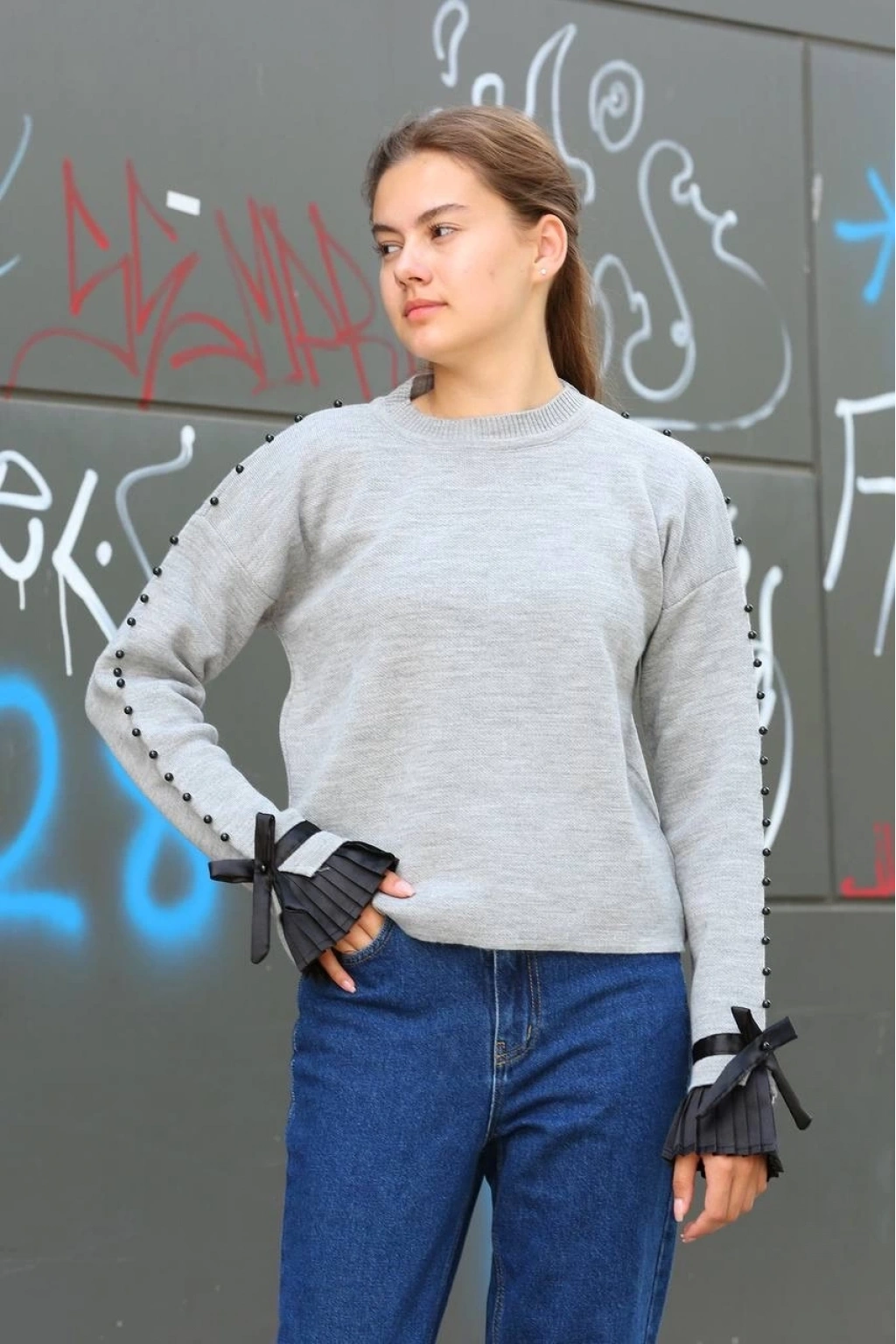 Şıklığı ve rahatlığı bir arada sunan Boncuklu Bile Detaylı Kazak Gri, gardırobunuzun vazgeçilmez parçalarından biri olmaya aday.