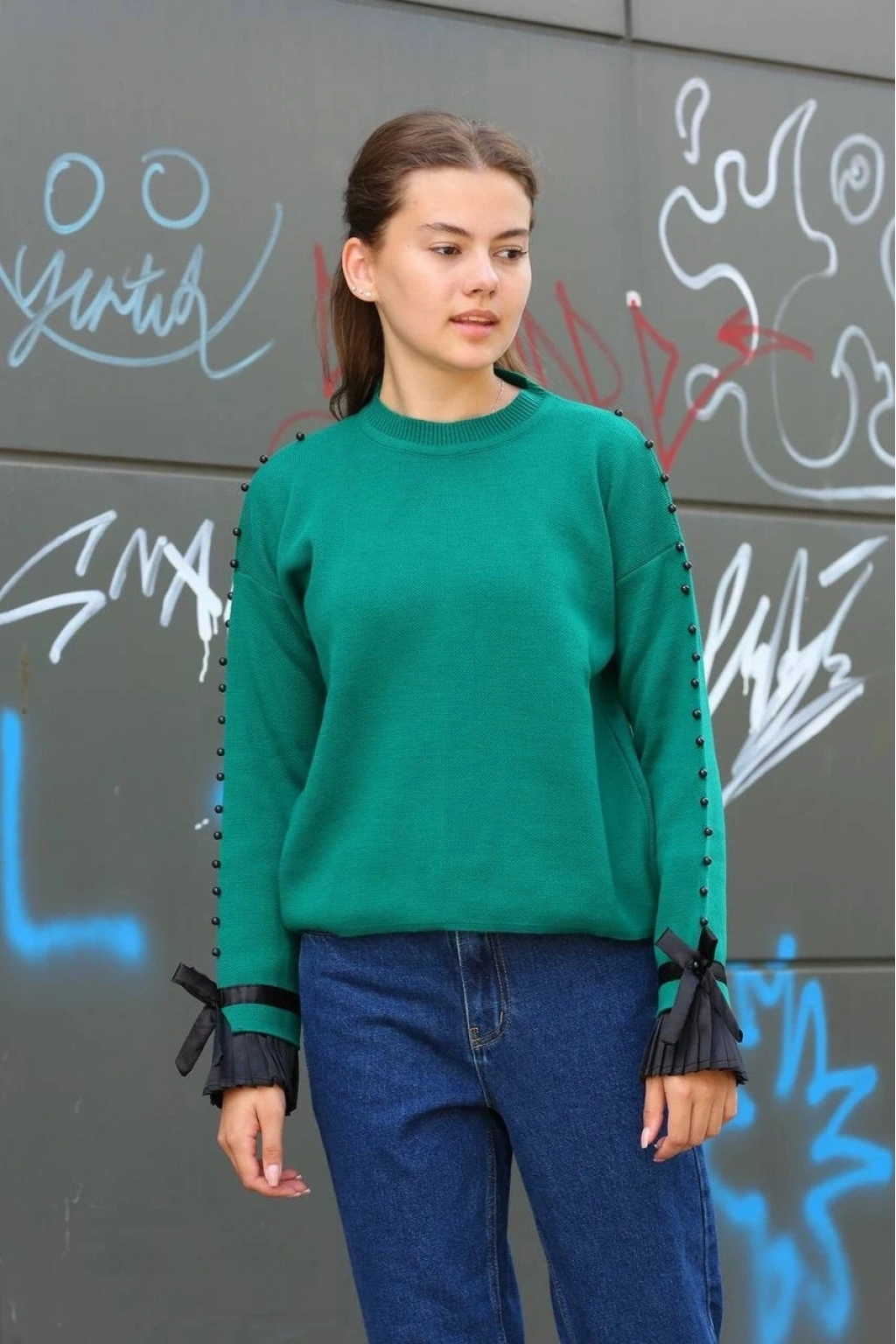 Şıklığı ve rahatlığı bir arada sunan Petrol Yeşili Boncuklu Detaylı Kazak, gardırobunuzun vazgeçilmez parçası olmaya aday!