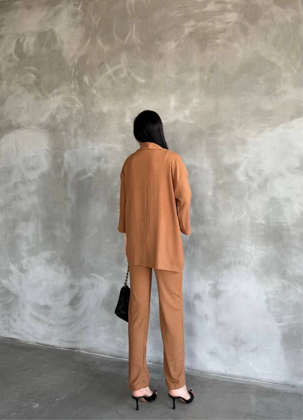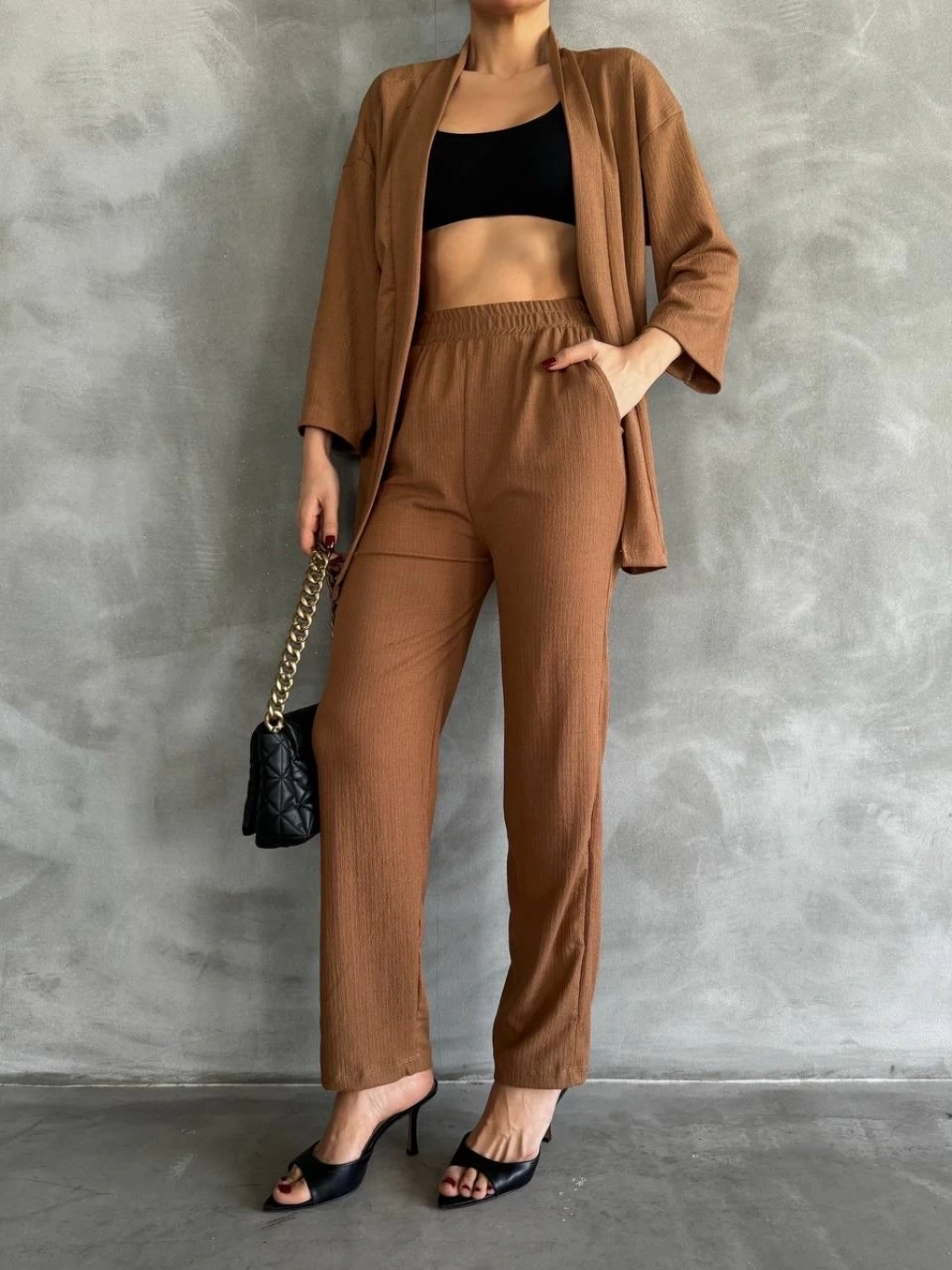 Bu bürümcük kumaş yakımlı kadın giyim takımı ile hem şık hem de rahat bir tarz yaratmak artık çok daha kolay.