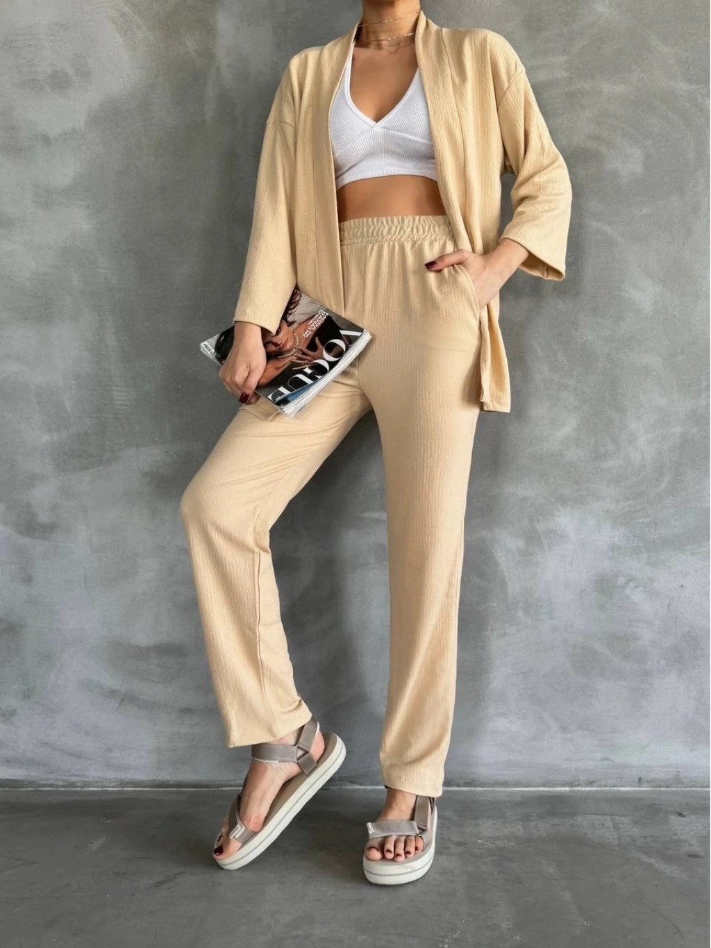 Bu bürümcük kumaş yakımlı kadın giyim takımı ile hem şık hem de rahat bir tarz yaratmak artık çok daha kolay.