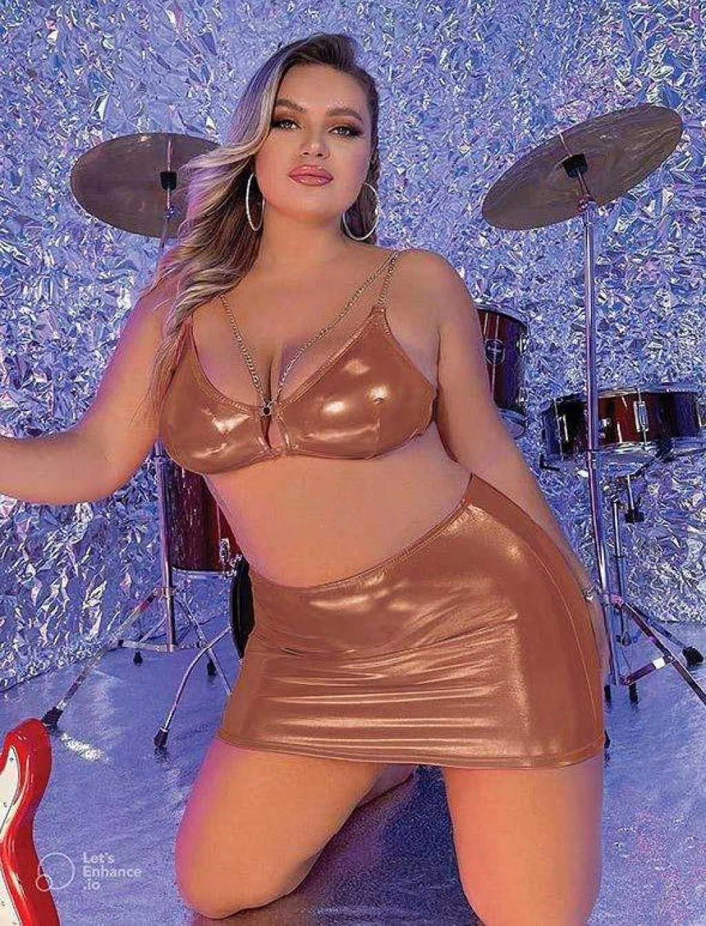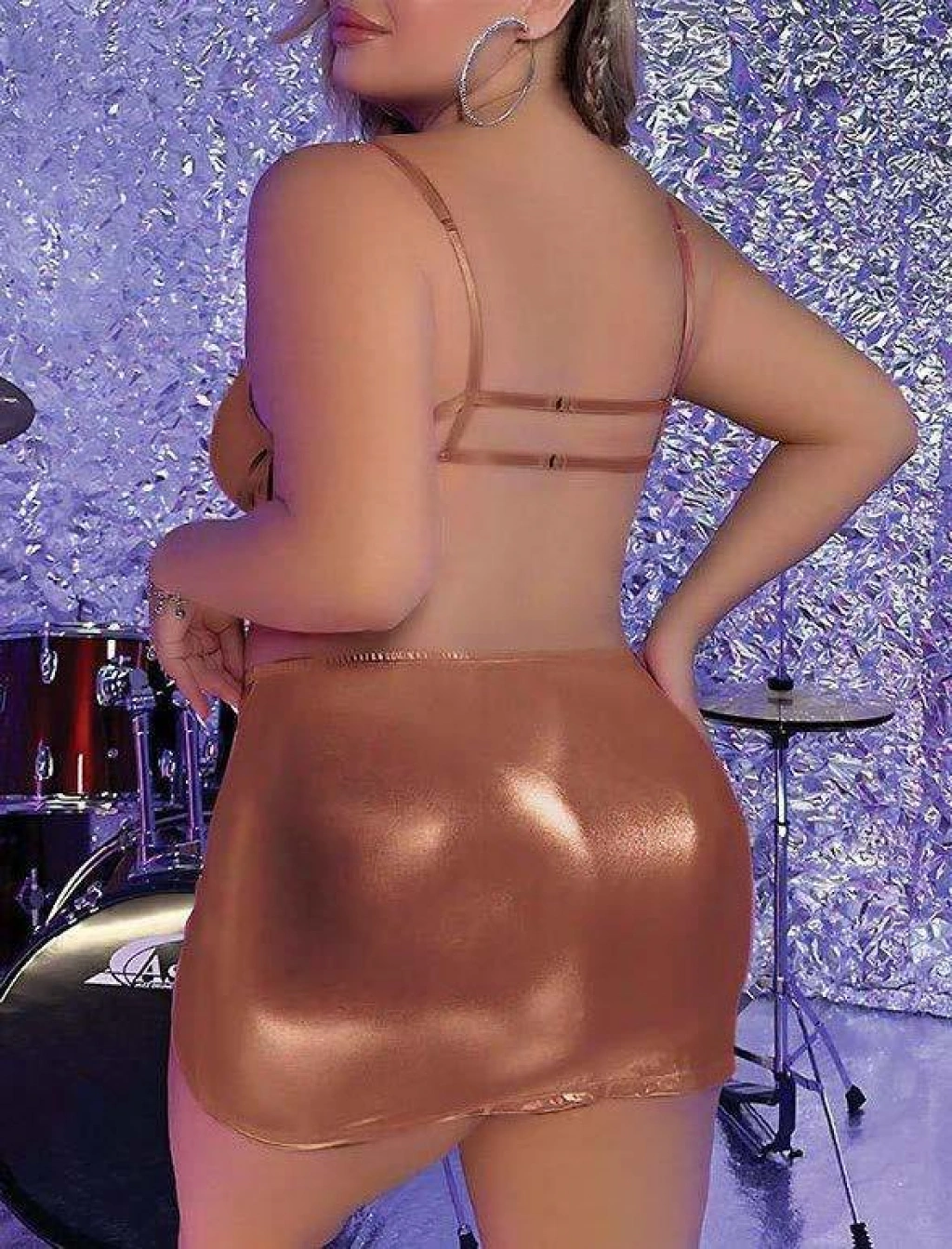 Parlak kahverengi deri görünümlü kumaşı ve göz alıcı metal zincir detaylarıyla bu takım, hem asil hem de iddialı bir duruş sunar. Mini deri eteği ve uyumlu üst parçasıyla feminenliği cesaretle buluşturur. Büyük beden kalıbıyla konforu şıklıkla birleştirir.