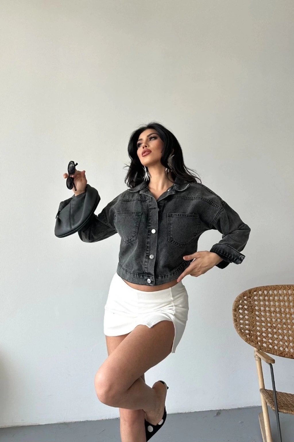 Yeni sezonda sokak modasına yön veren çift cepli kol katlamalı süper taş enzim yıkama crop kot ceket ile tarzınızı ön plana çıkarın.