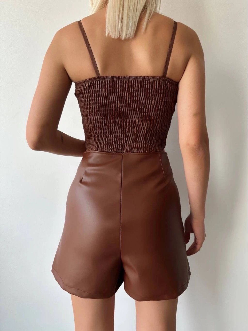 Çift fermuar detaylarıyla şıklığı ve rahatlığı bir arada sunan Kahve Deri Şort ile tarzınızı yansıtın.