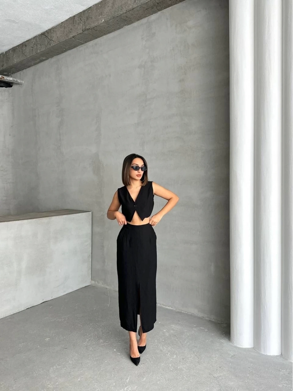 KAZAX markasının şık ve zarif tasarımıyla öne çıkan çilek takımı, etek ve yelek kombinasyonuyla dikkat çekiyor.