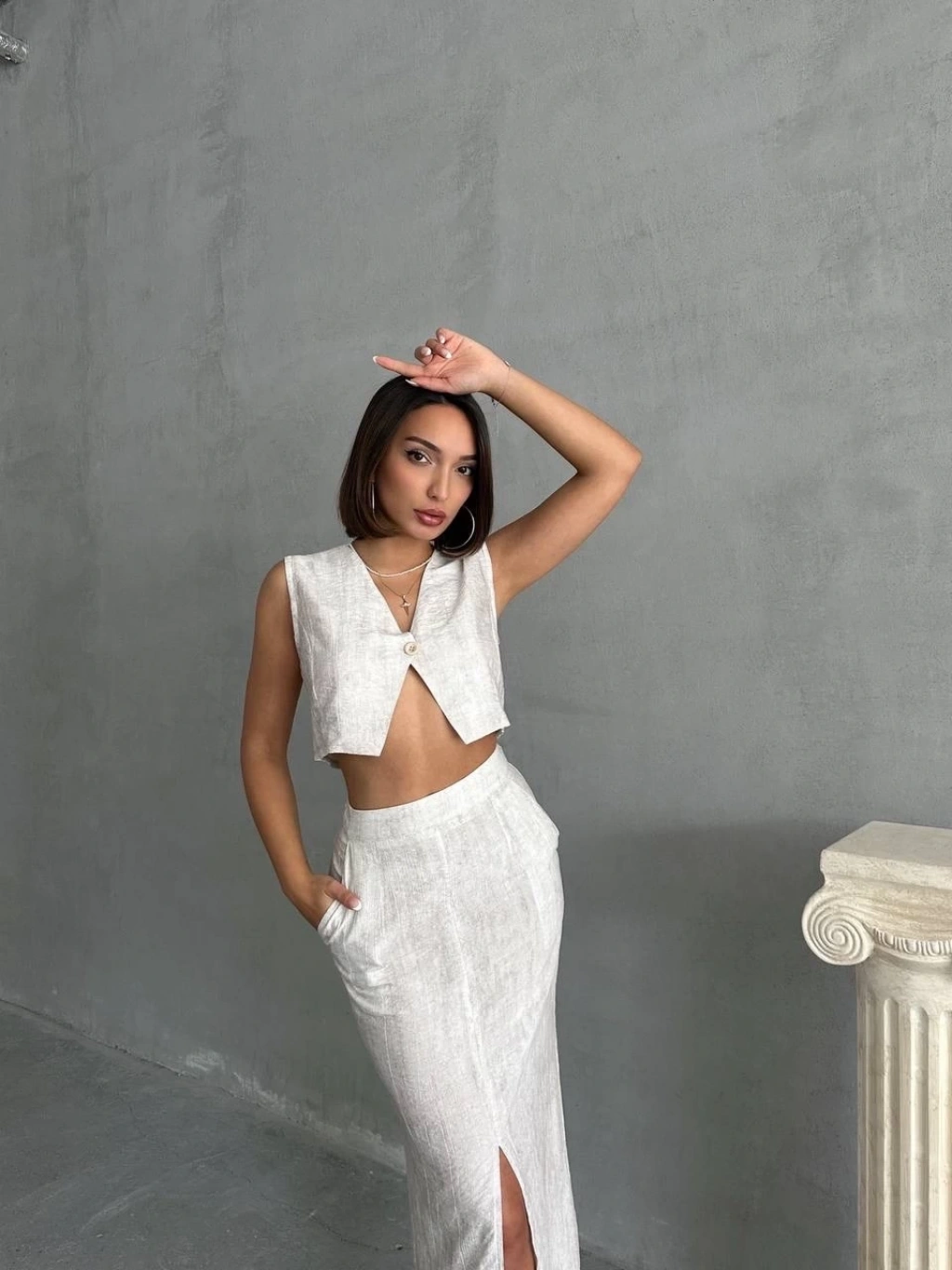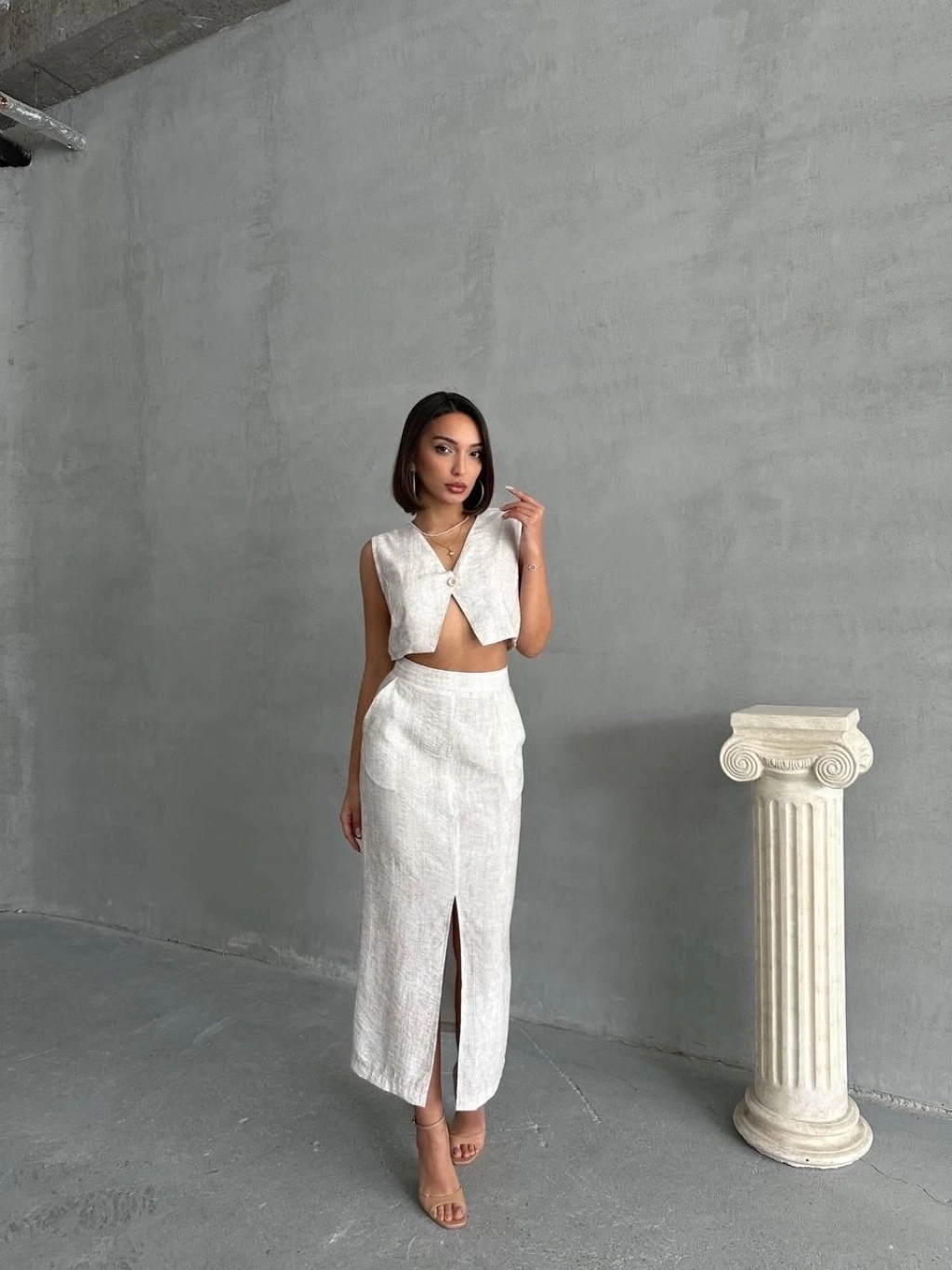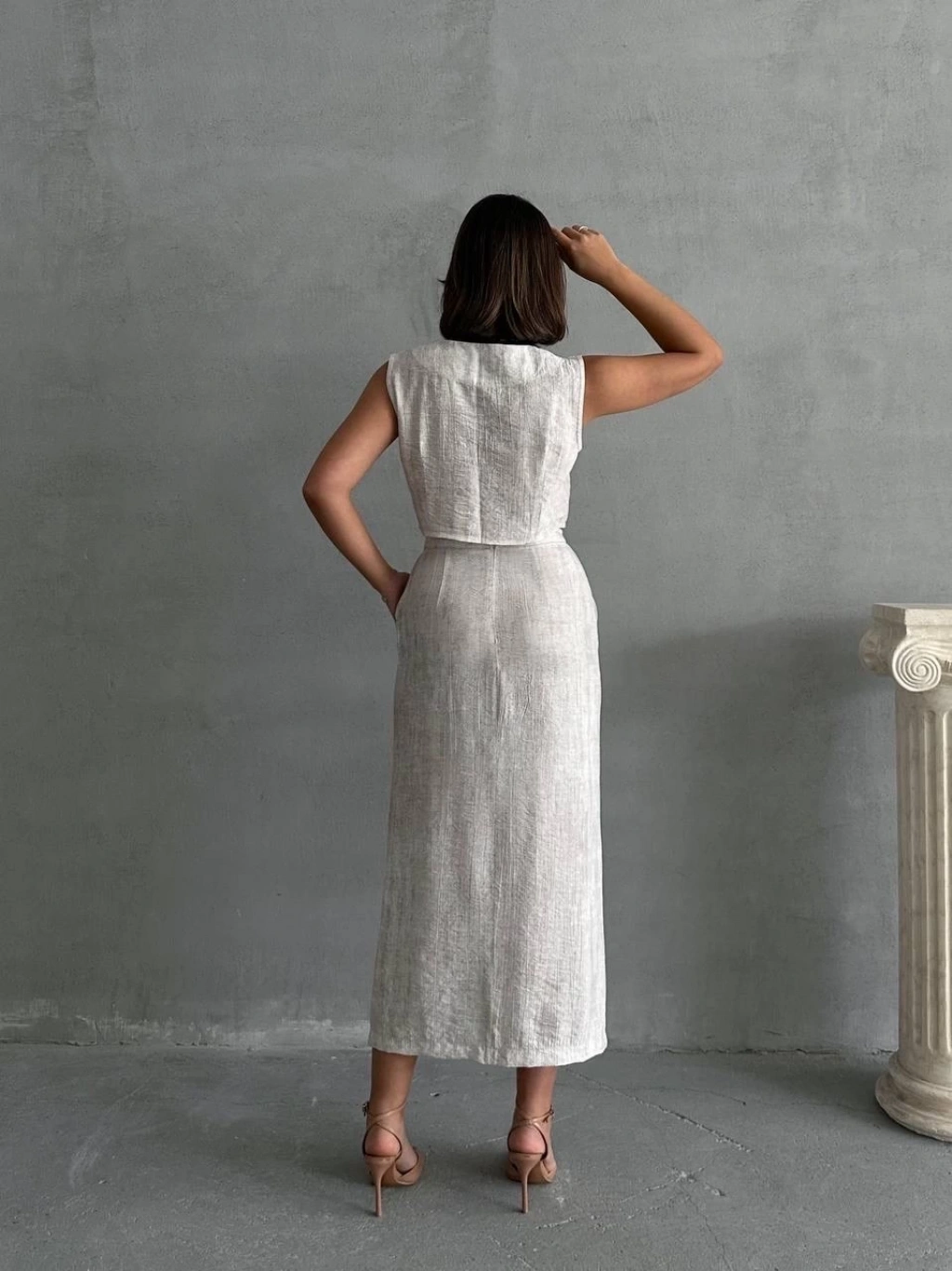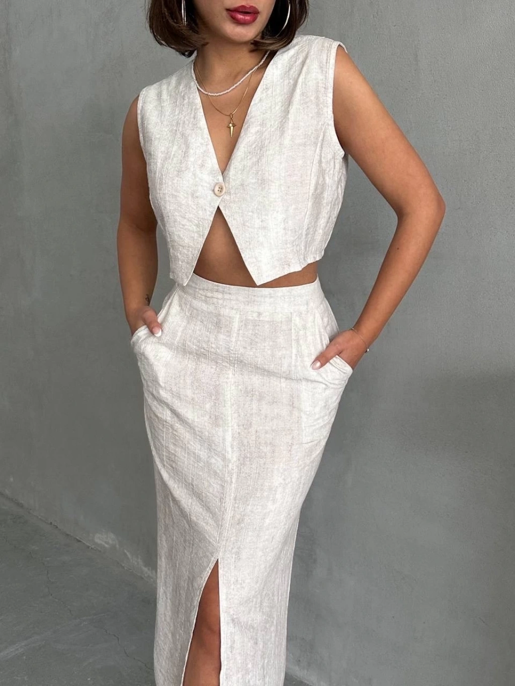 KAZAX markasının şık ve zarif tasarımıyla öne çıkan çilek takımı, etek ve yelek kombinasyonuyla dikkat çekiyor.