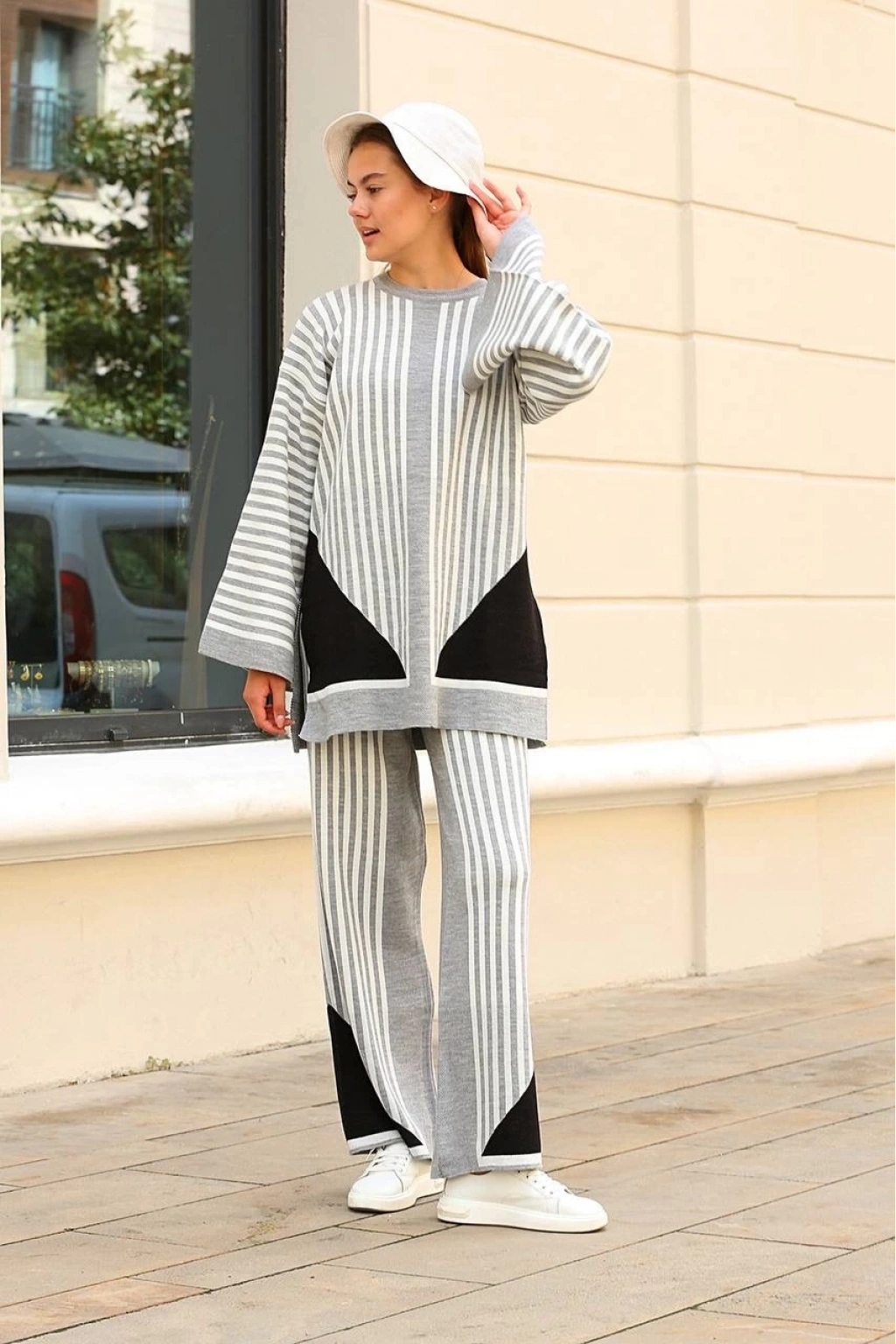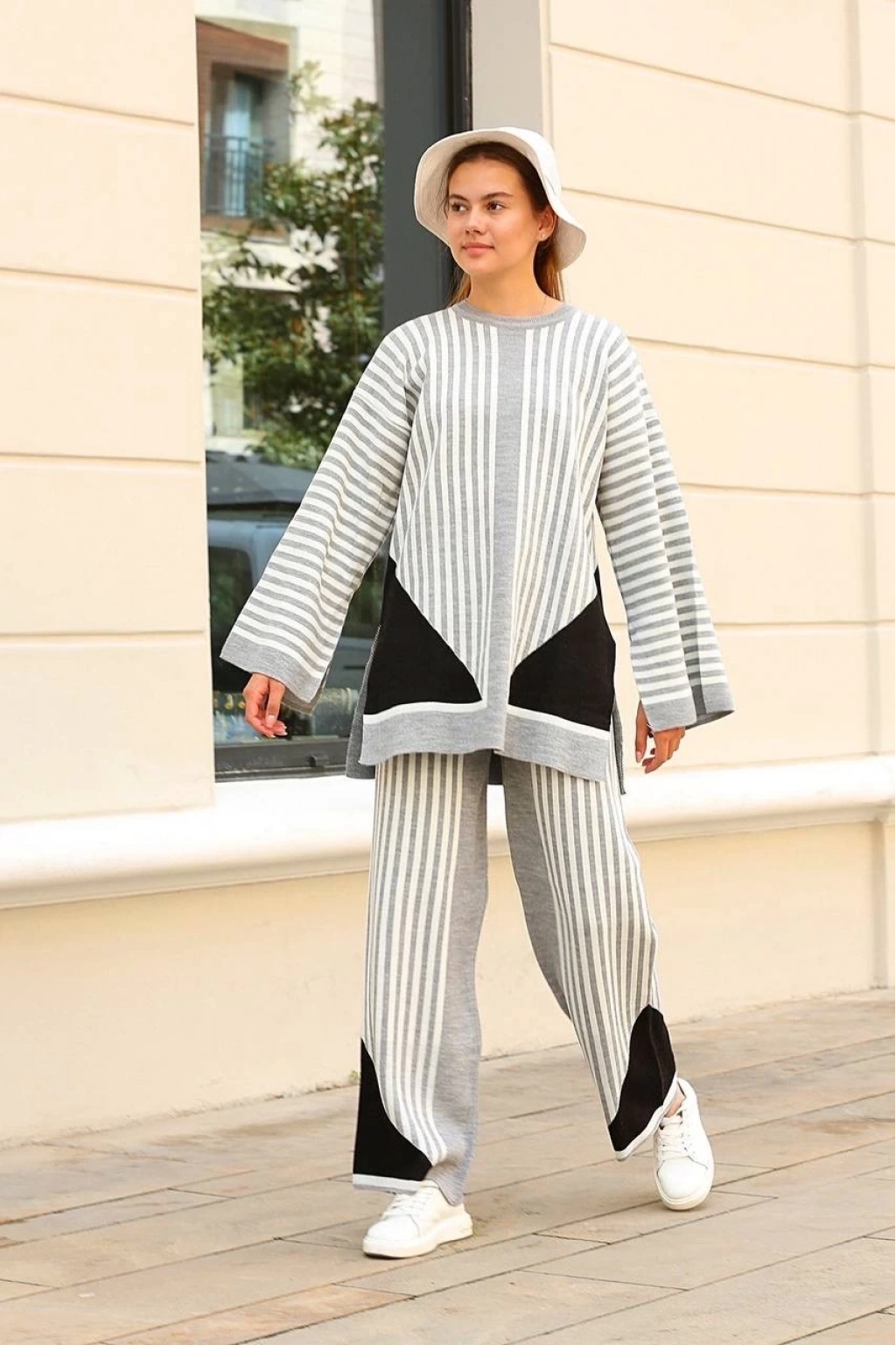 Bu çizgili bisiklet yaka triko takım Gri rengi ile şıklığı ve rahatlığı bir arada sunuyor.