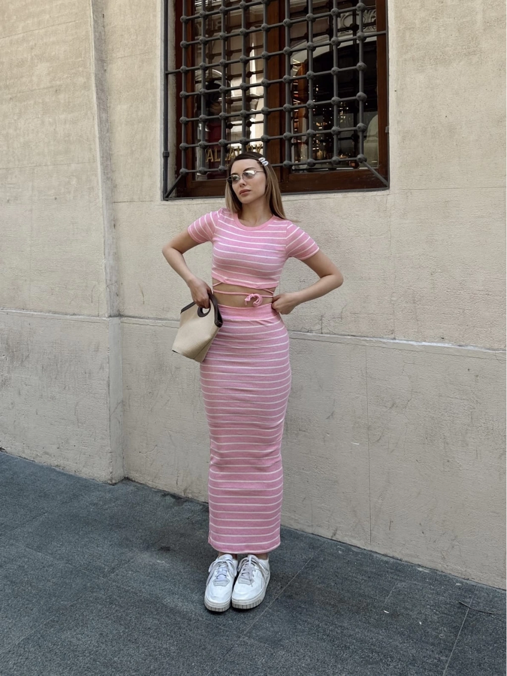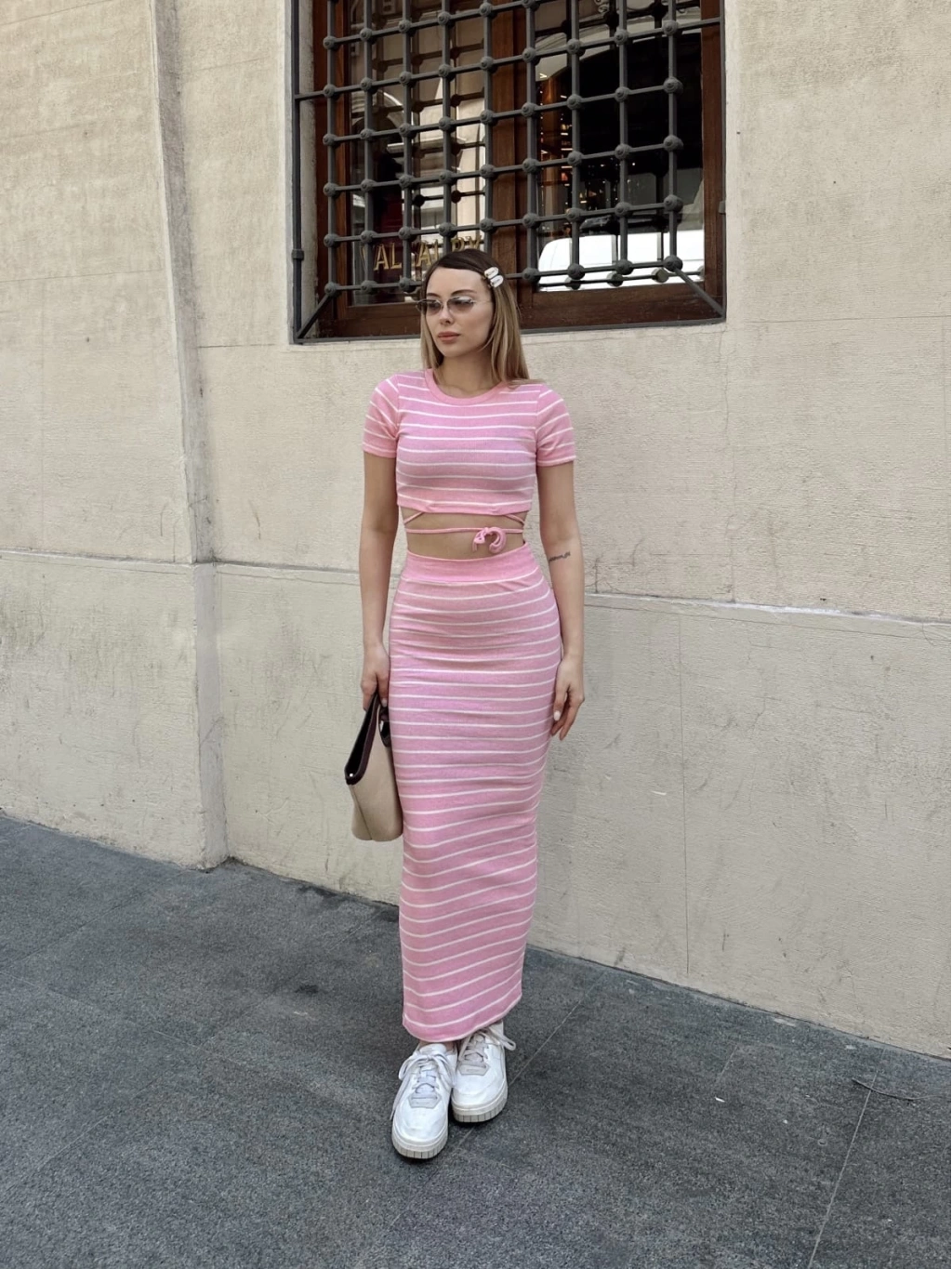 Bu sezonun trendlerine uygun şık ve şık bir seçenek olan Pembe Çizgili Etekli Takım, gardırobunuzun favori parçaları arasında yer alacak. Hem şık hem de rahat tasarımı ile öne çıkan bu takım, her türlü özel buluşma veya günlük aktivite için mükemmel bir seçimdir.