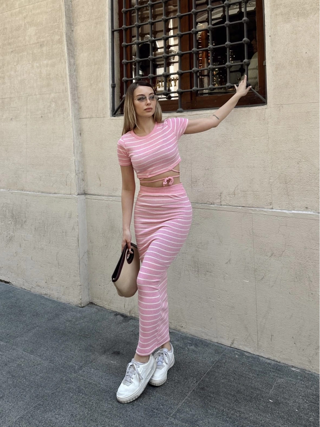 - Takımın üst kısmı pembe renkte ve çizgili desenlidir.