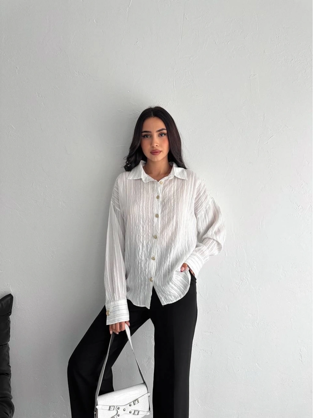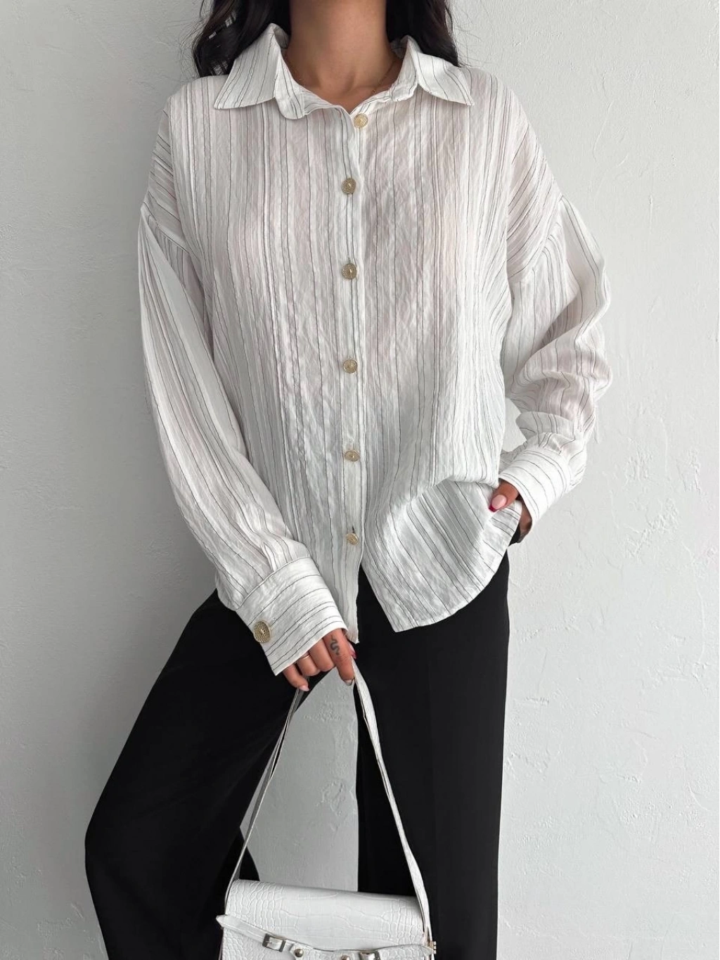 KAZAX çizgili oversize gömlek, rahat ve şık bir görünüm sunar.