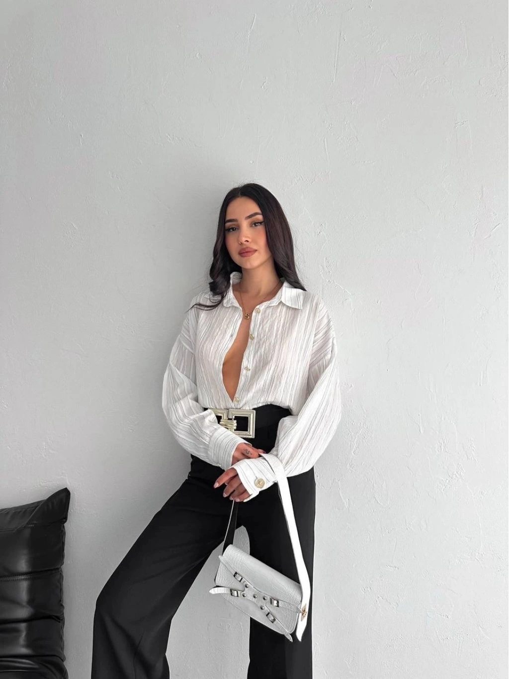 BİÇOMİ Yanı kemer detaylı crop gömlek siyah s4009