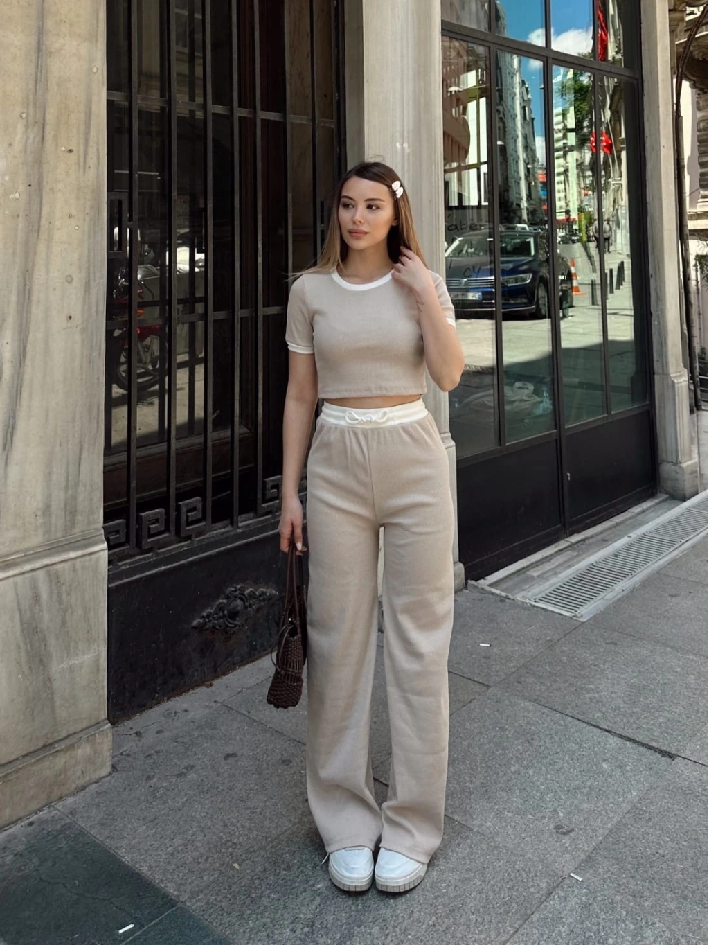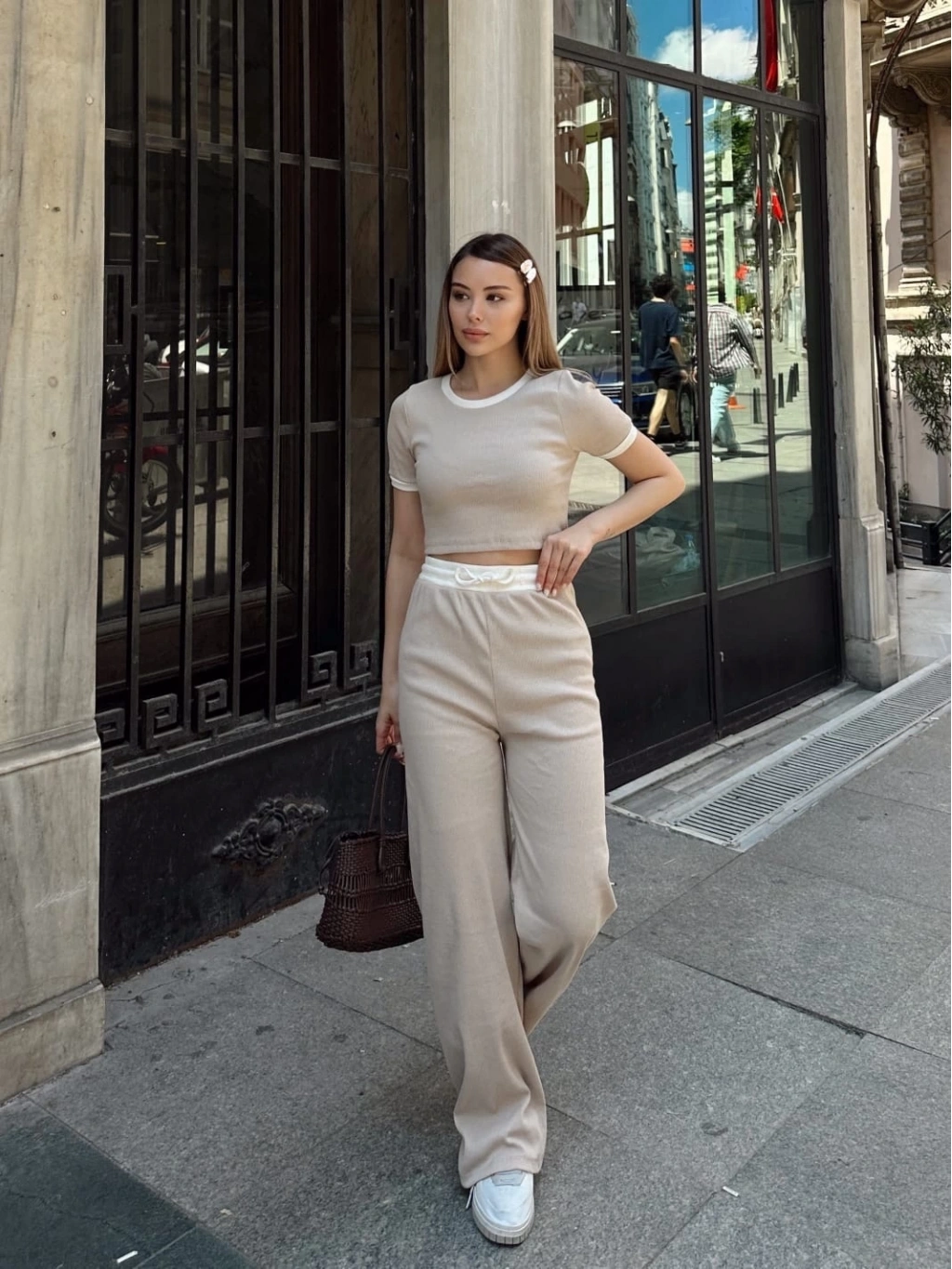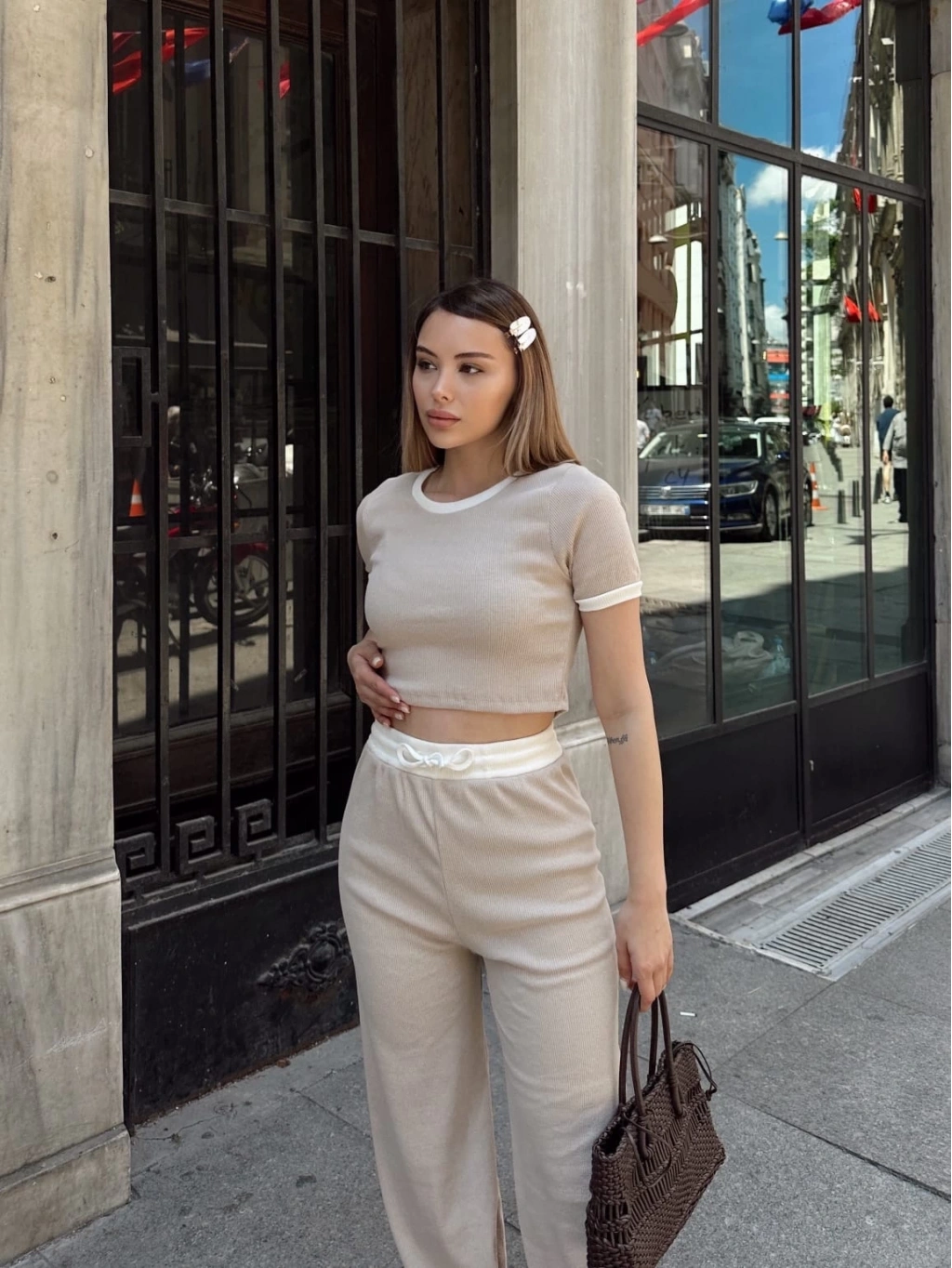 Yumuşak dokulu ve rahat kesime sahip bej renkli crop pantolon ve bilek detaylı ceketten oluşan şık takım.