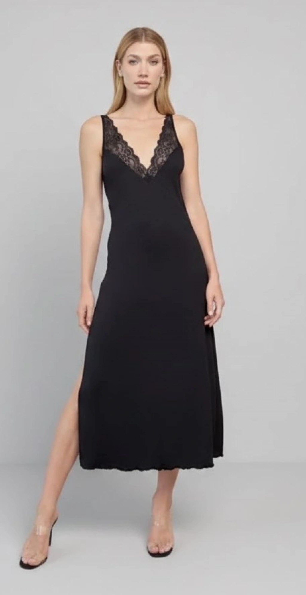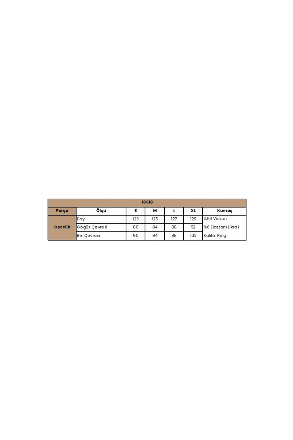 Gecelik: Siyah renklidir, derin V Yakalıdır, göğüs ve sırt dekoltelidir, ayalanabilir ip askılıdır, yakası ve askı ön kenarları ile sırtı dantellidir, yırtmaçlıdır, örme kumaştır.