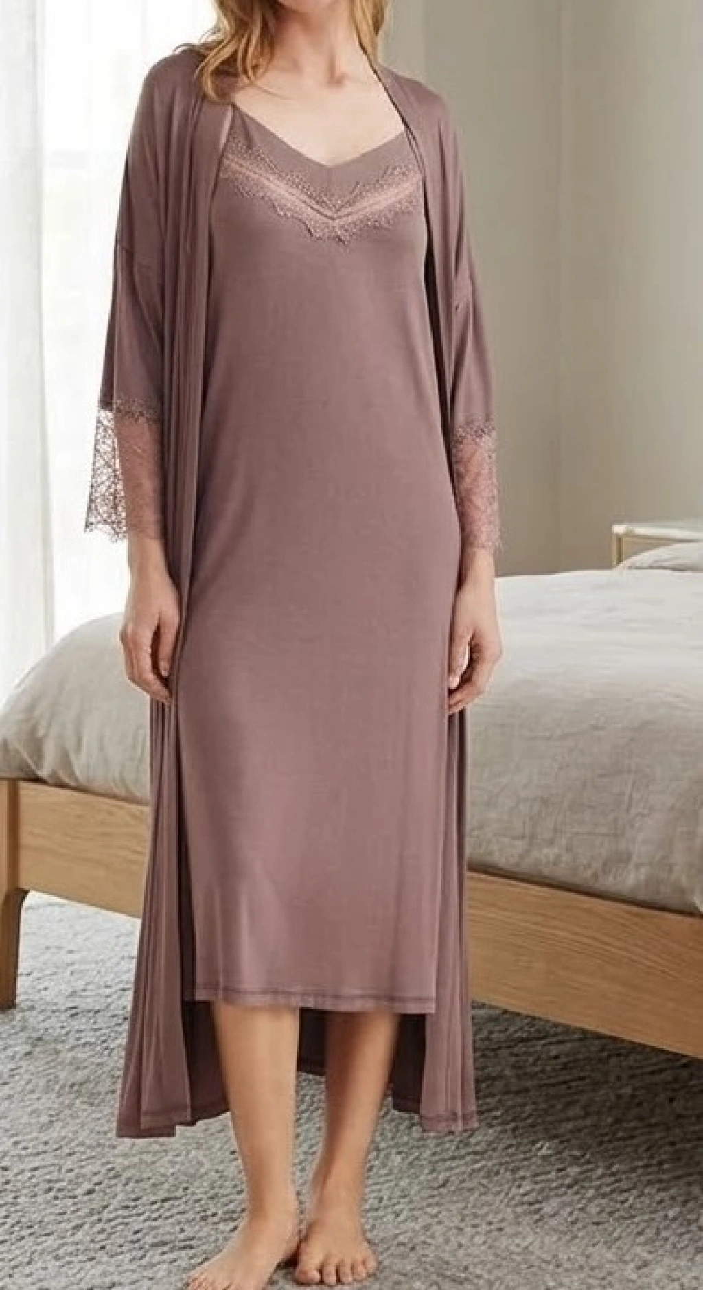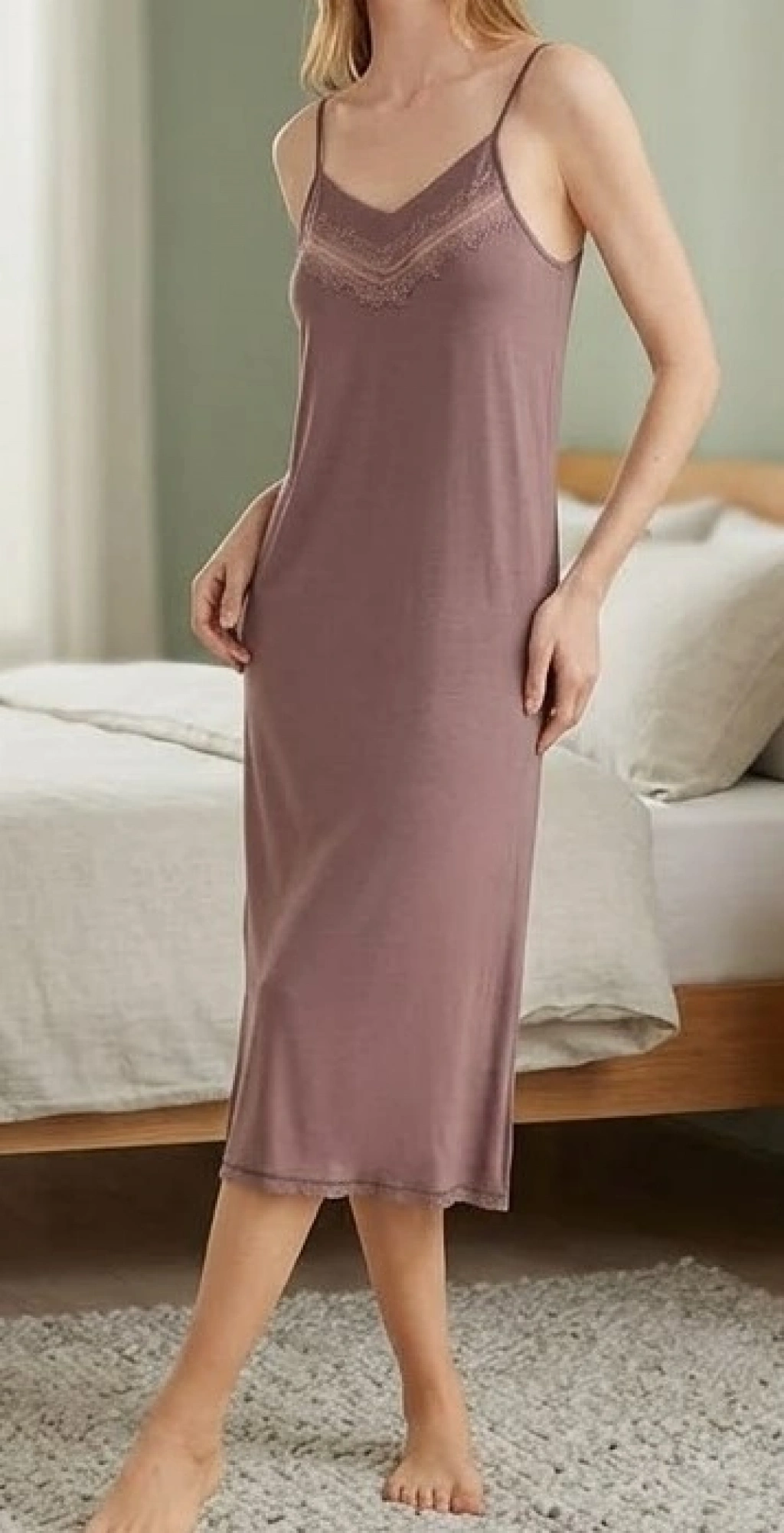 Gecelik: Kahverengi renklidir, ayarlanabilir ip askılıdır, derin V yaka dekoltelidir, göğüs kısmı dantellidir, örme kumaştır.