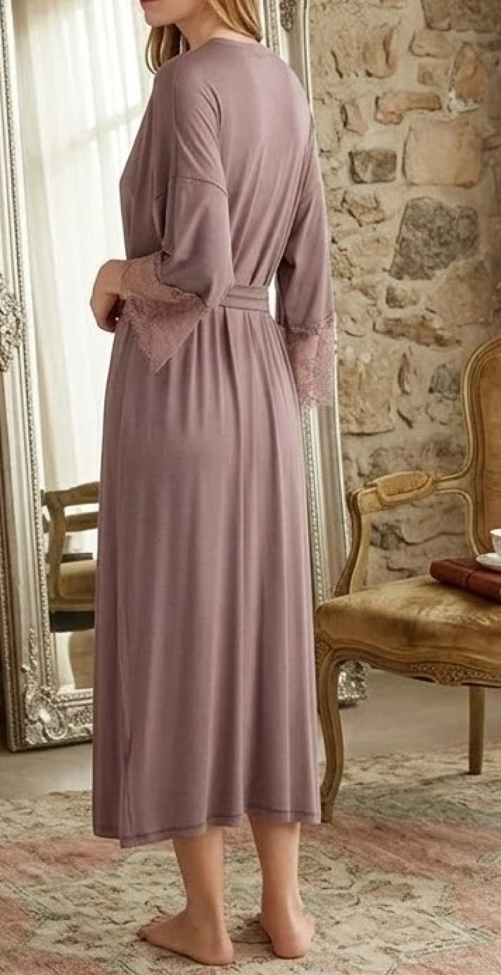 İkili Kombin Avantajı: Zarif askılı geceliği ve ona eşlik eden uzun kollu, kuşaklı sabahlığı ile tam bir set olarak sunulur. İster uyurken ister sabah kahvenizi yudumlarken size eşlik eder.