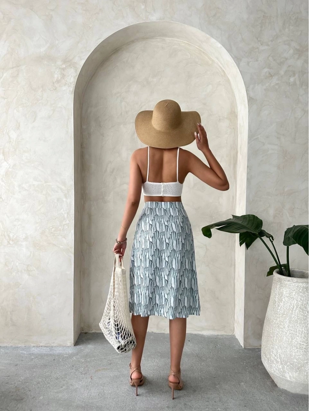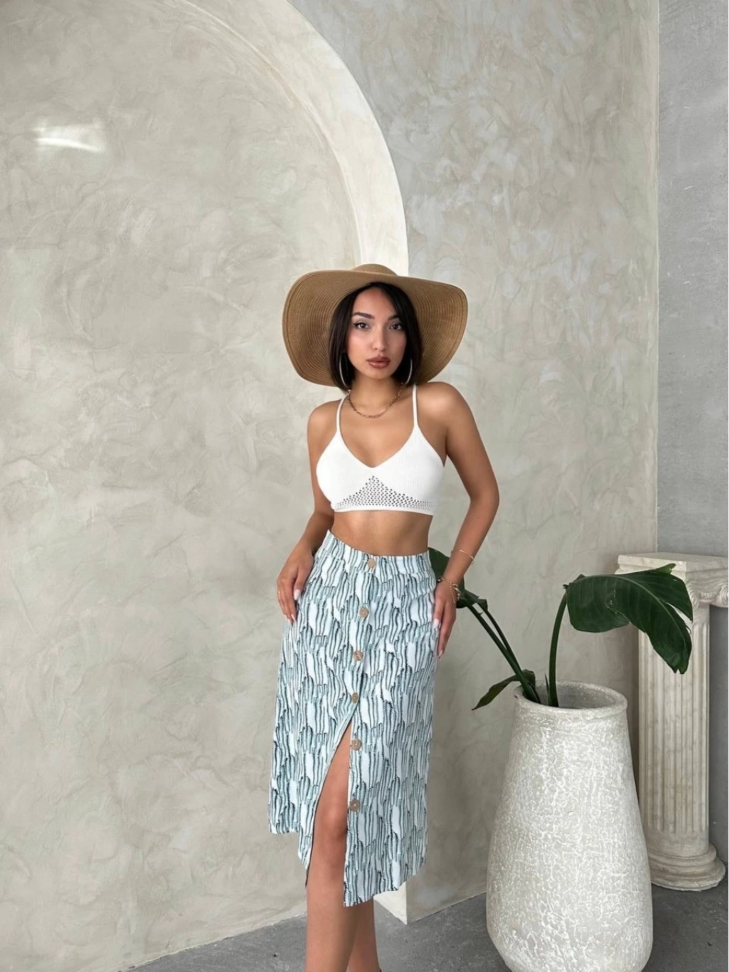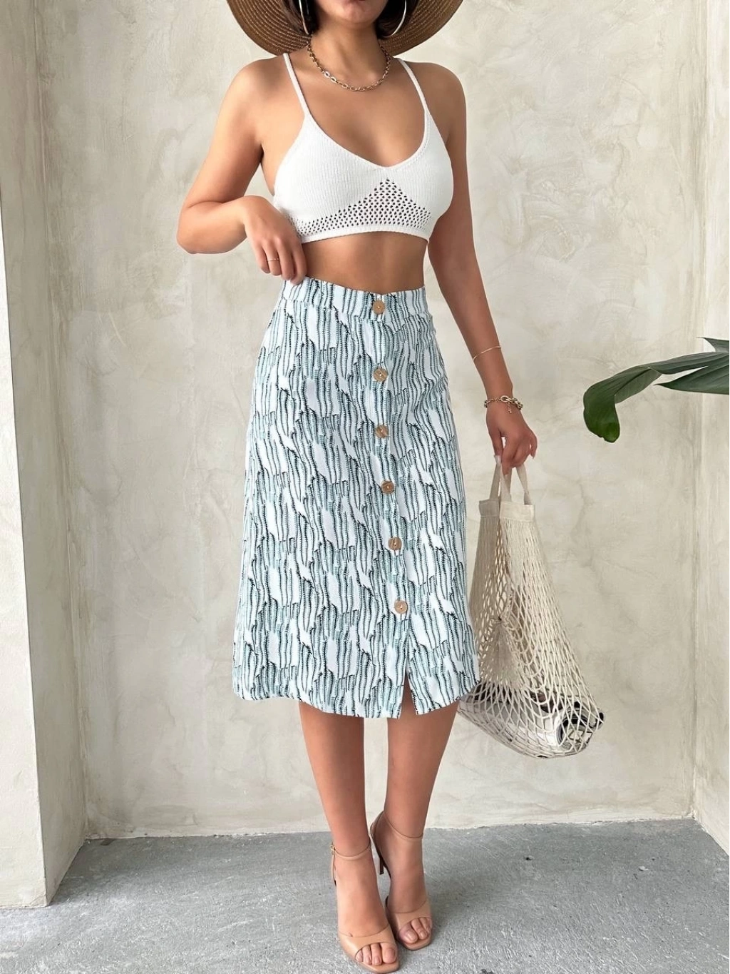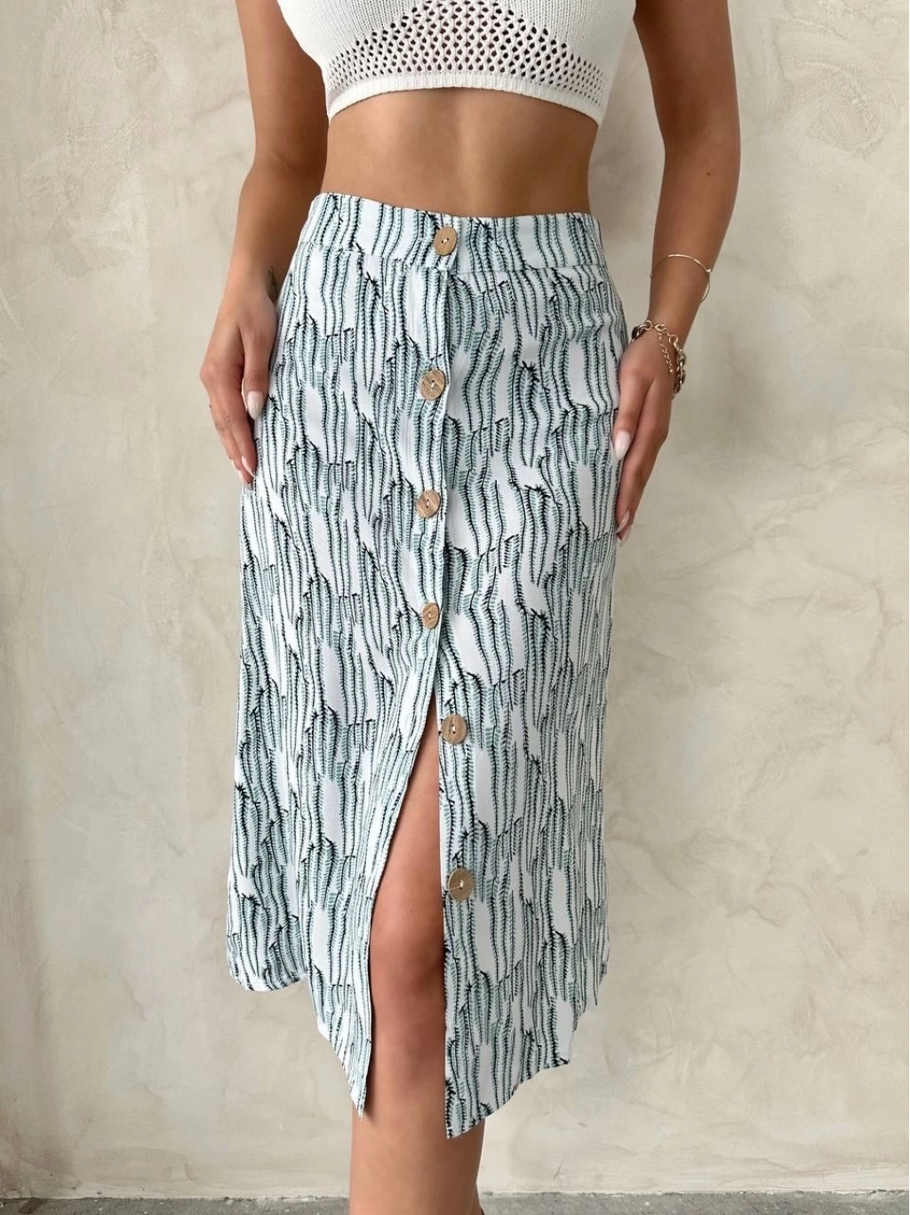 Bu desenli düğmeli etek, şıklık ve rahatlığı bir arada sunuyor. Sade ve zarif tasarımı ile her tarza uyum sağlayan bir parça.