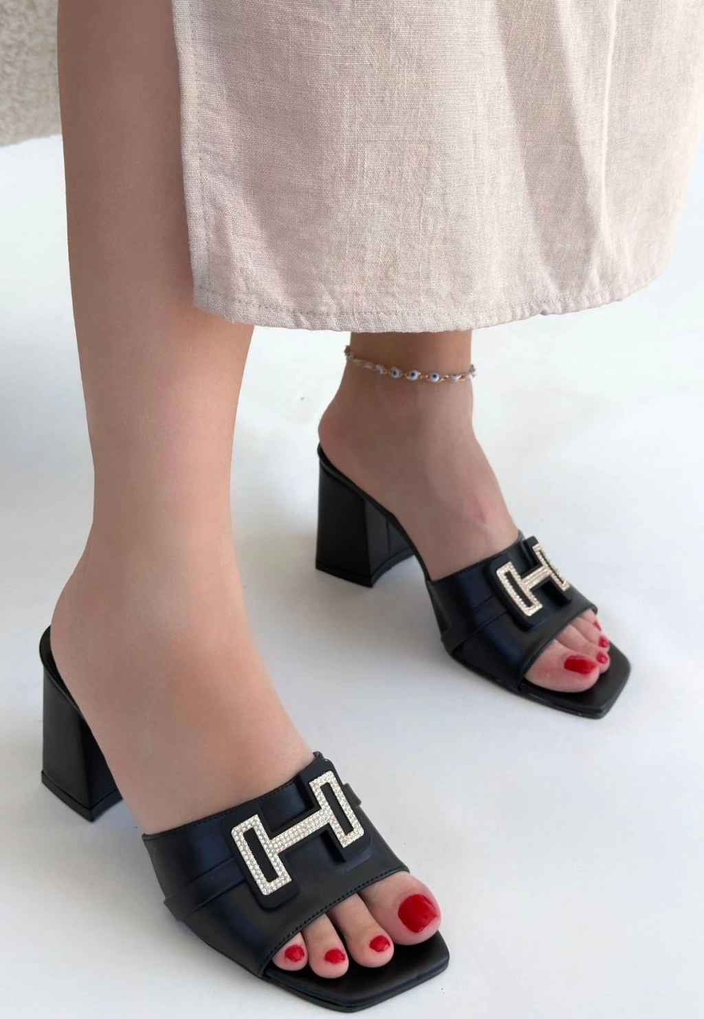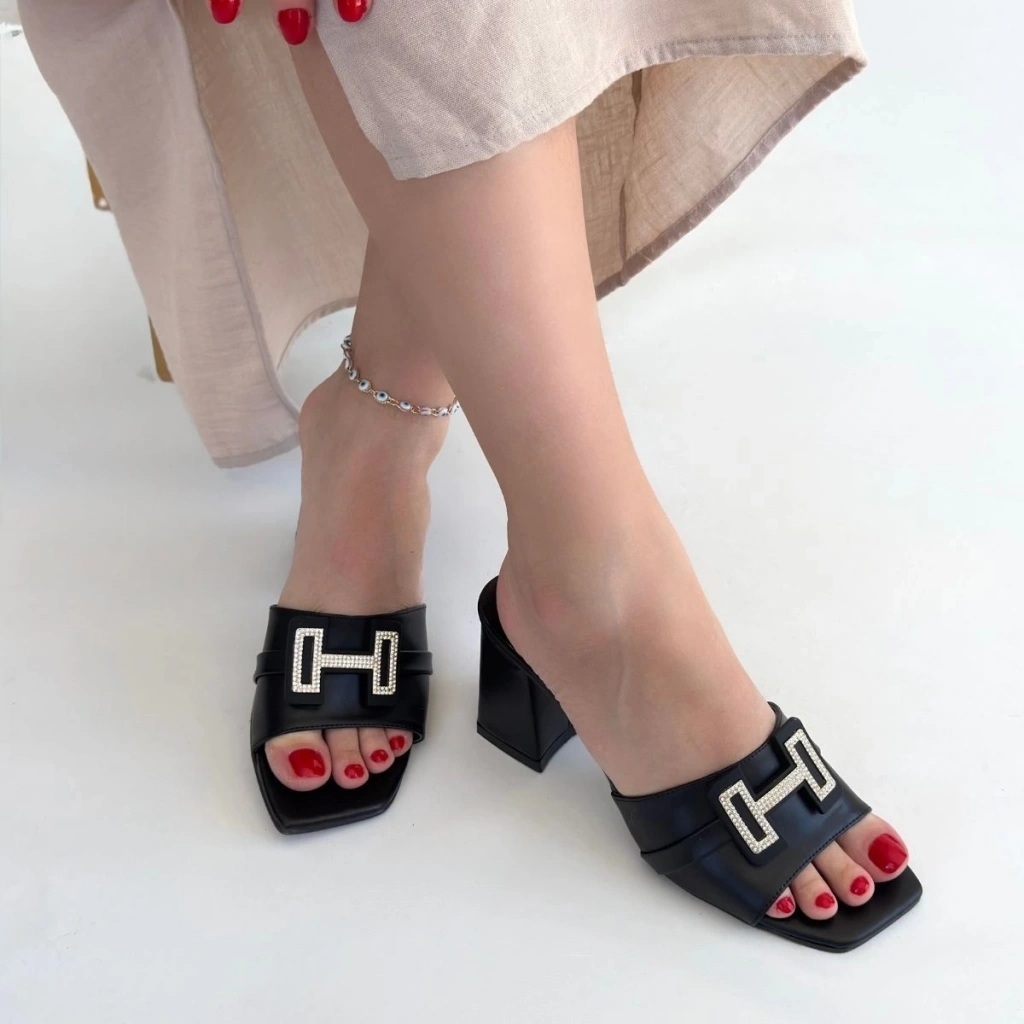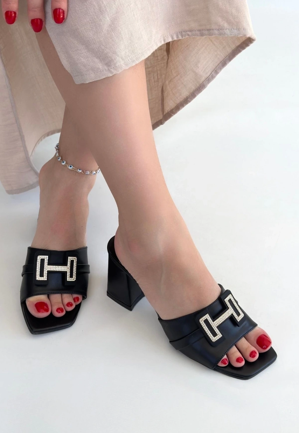 BİÇOMİ Erew Siyah Cilt Topuklu Terlik