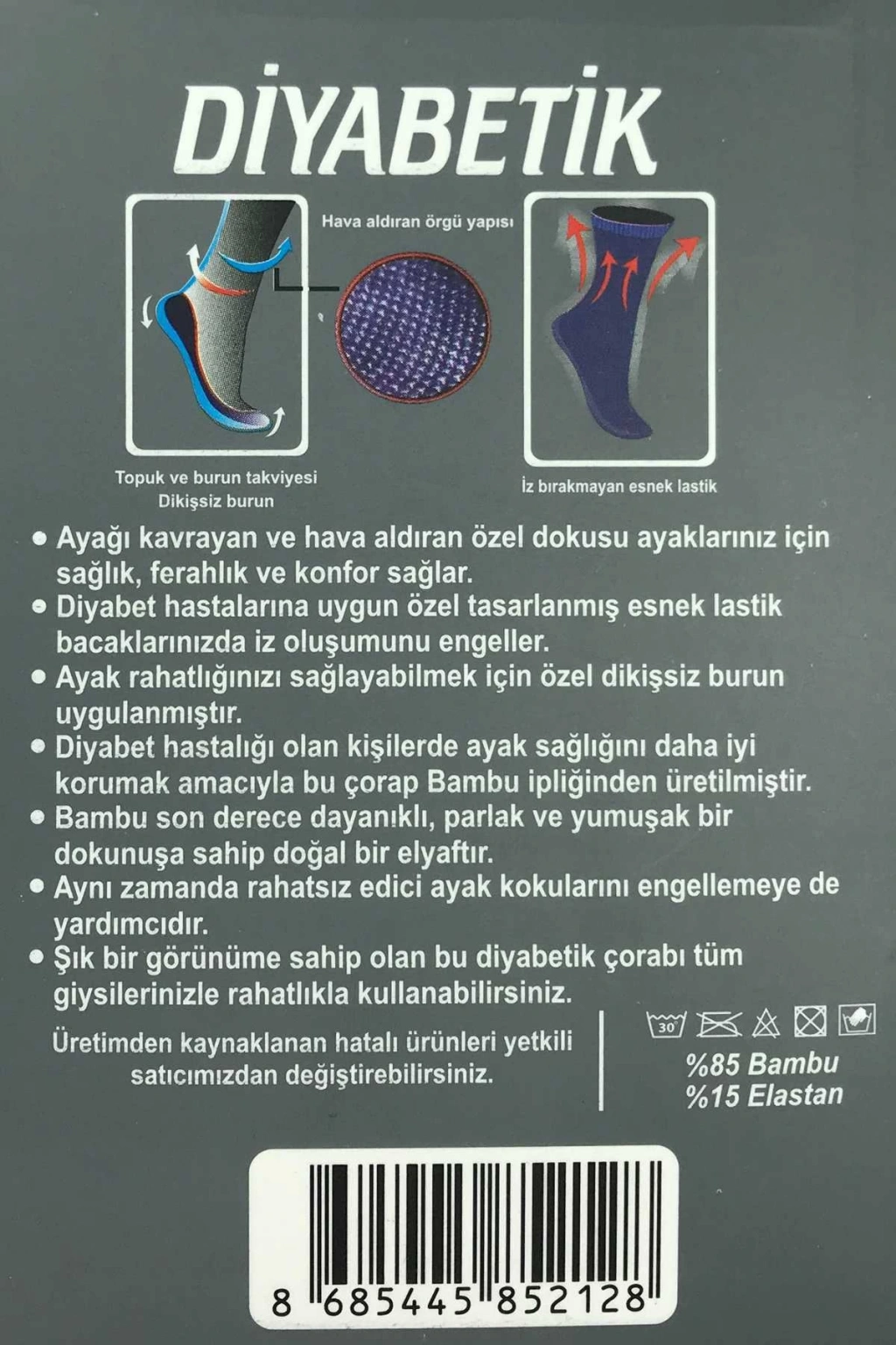Erkek Bambu Lastiği Sıkmayan Diyabetik Çorap Ayağı kavrayan ve hava aldıran özel dokusu ayaklarınız için sağlık, ferahlık ve konfor sağlar. Diyabet hastalarına uygun özel tasarlanmış esnek lastik bacaklarınızda iz oluşumunu engeller. Ayak rahatlığınızı sağlayabilmek için özel dikişsiz burun uygulanmıştır. Diyabet hastalığı olan kişilerde ayak sağlığını daha iyi korumak amacıyla bu çorap Bambu ipliğinden üretilmiştir. Bambu; son derece dayanıklı, parlak ve yumuşak bir dokunuşa sahip doğal elyaftır. Aynı zamanda rahatsız edici ayak kokularını engellemeye de yardımcıdır. Şık bir görünüme sahip olan bu diyabetik çorabı tüm giysilerinizde rahatlıkla kullanabilirsiniz. % 85 Bambu % 15 Elestandır. 40-45 numara için uygundur. |