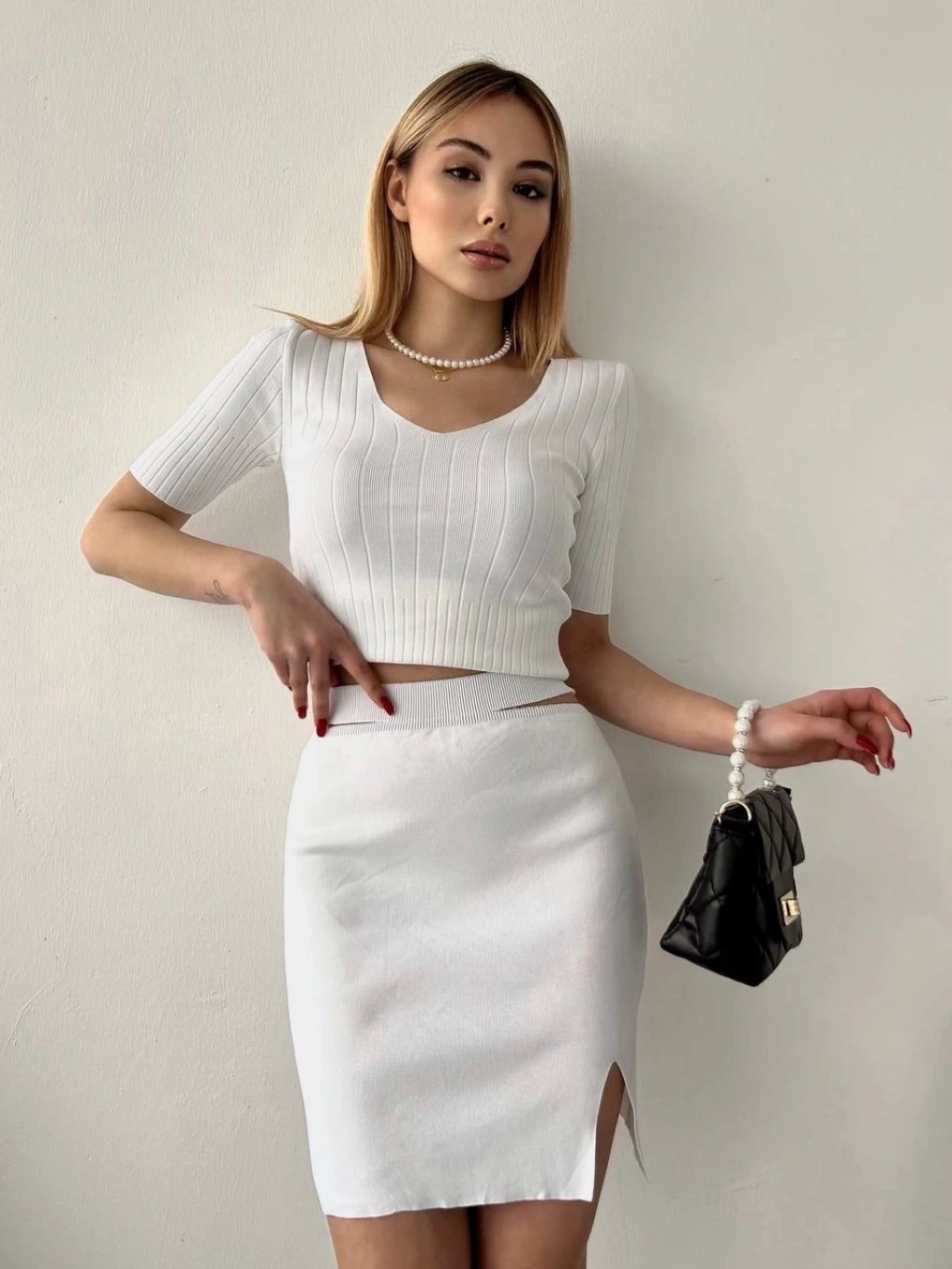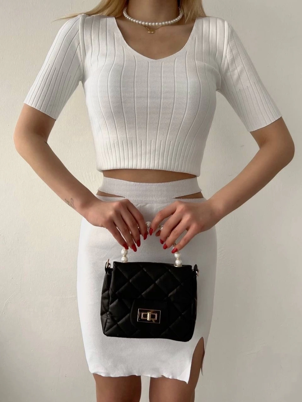 Şıklığı ve konforu bir arada sunan Etekli Triko Takım Beyaz T23107, gardırobunuzun vazgeçilmezi olmaya aday!