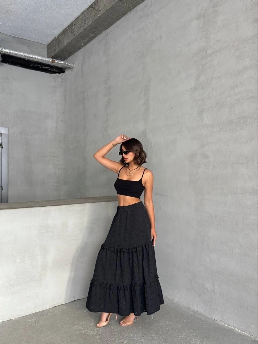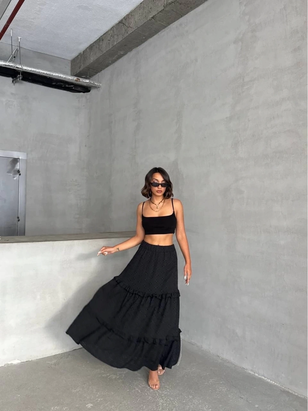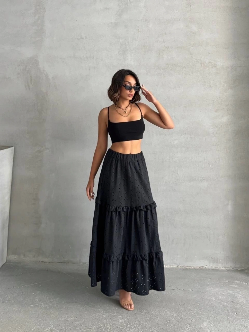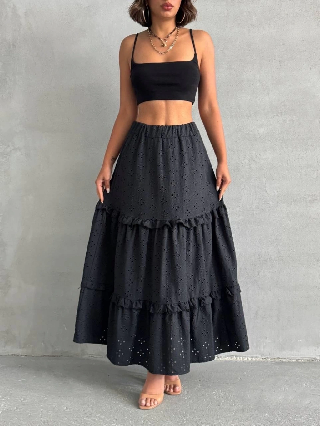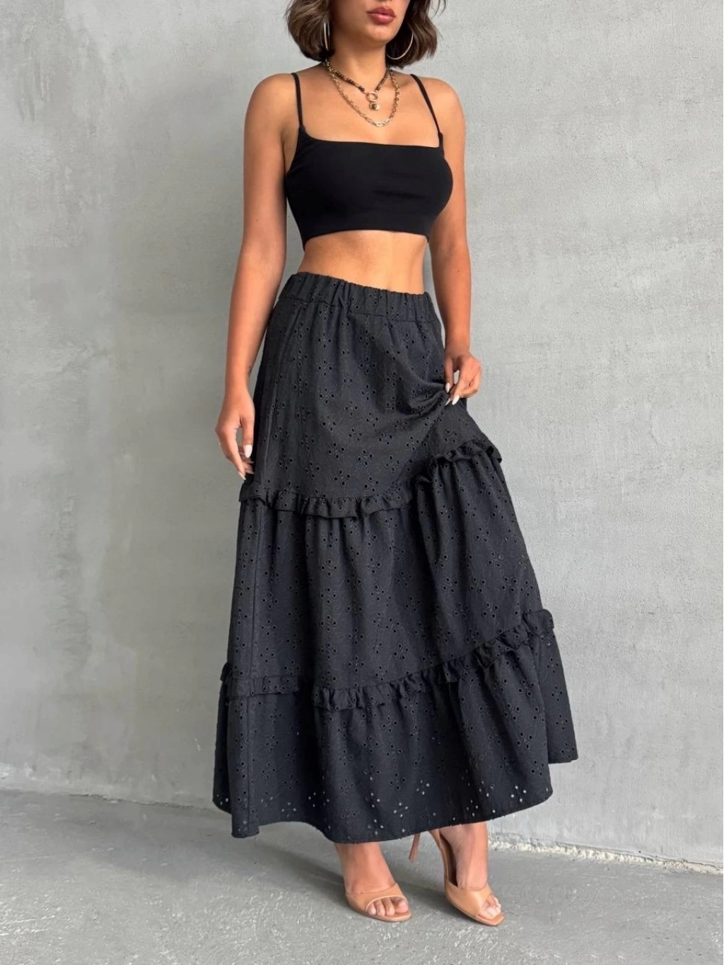 Şıklık ve tarzı bir arada sunan fırfırlı brodeli astarlı uzun etek, gardırobunuzun vazgeçilmez parçalarından olmaya aday.