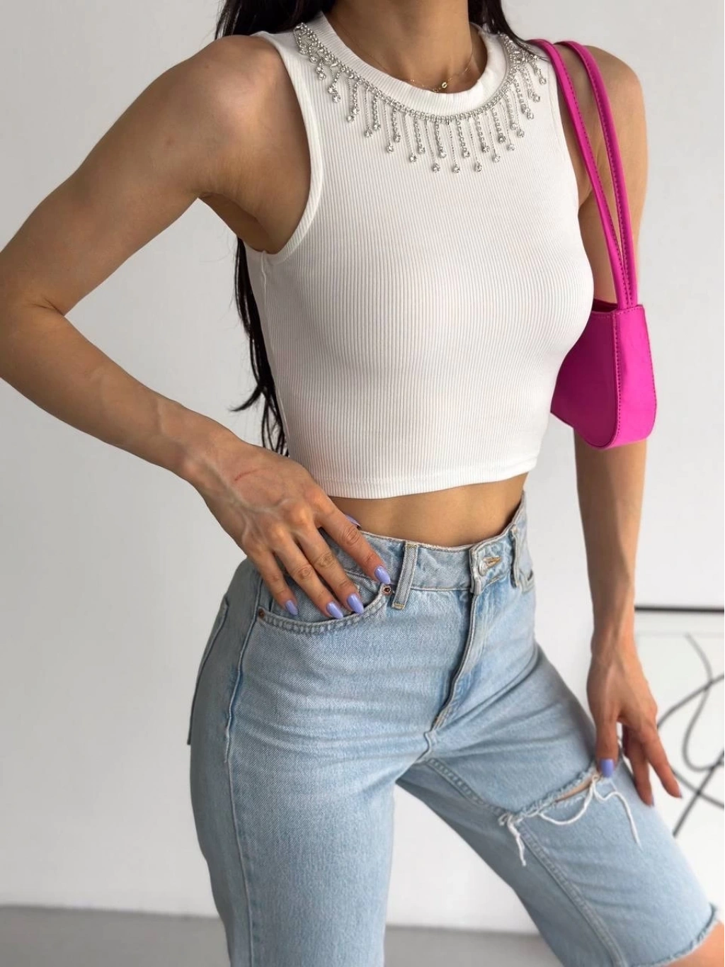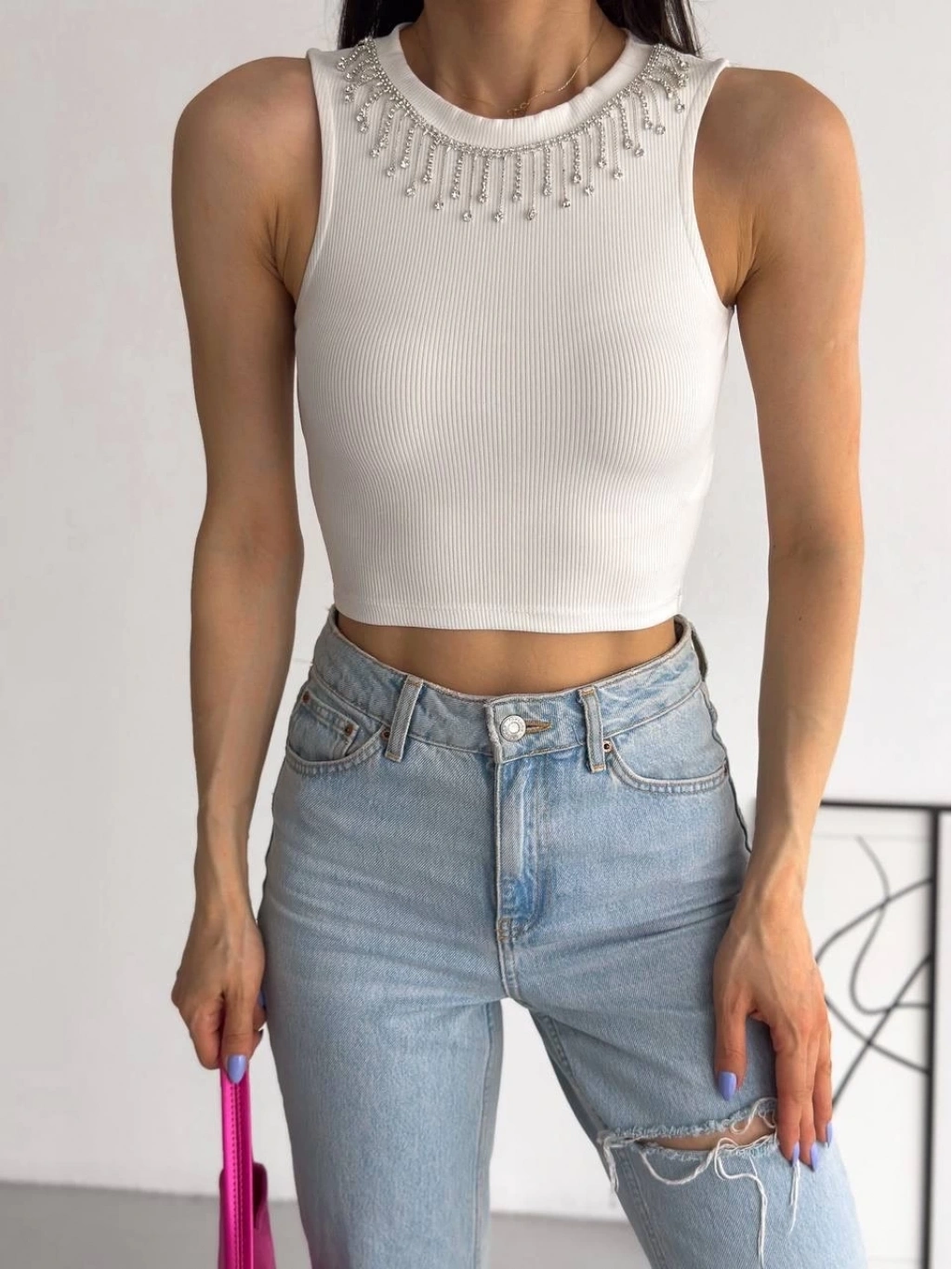 BİÇOMİ fitilli kaşkorse yakası zincirli atlet beyaz