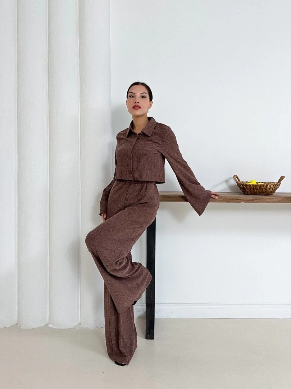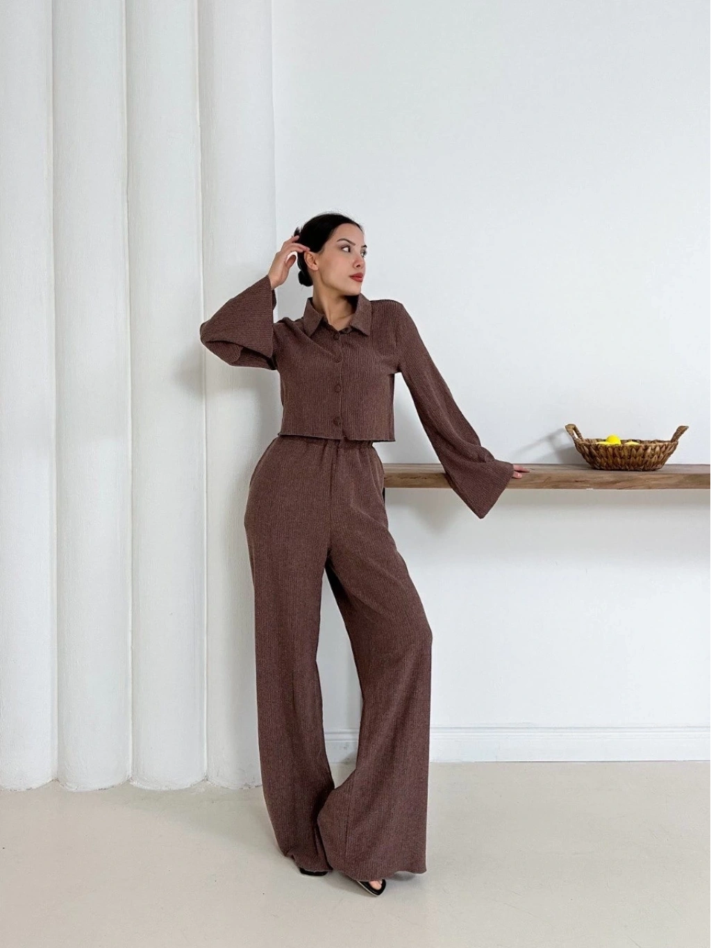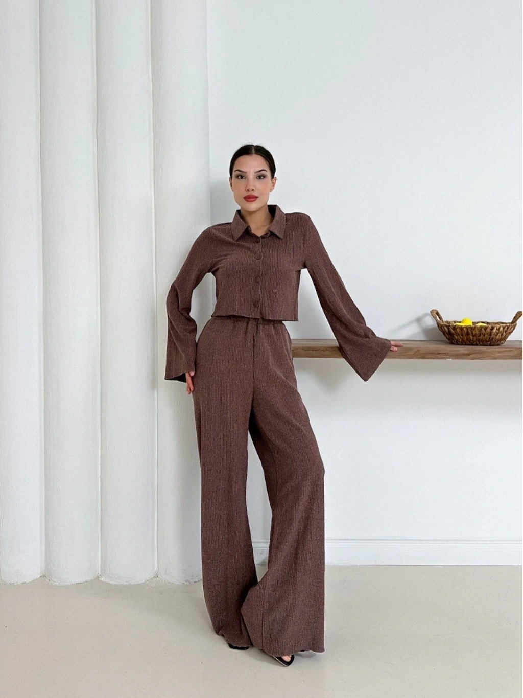 BİÇOMİ Büzgülü etek bluz takım kahve s24709