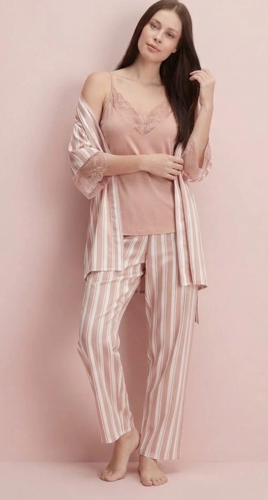 Pijama altı, ip askılı üst ve sabahlıktan oluşan bu set, günün farklı saatleri için pratik bir çözüm sunar: