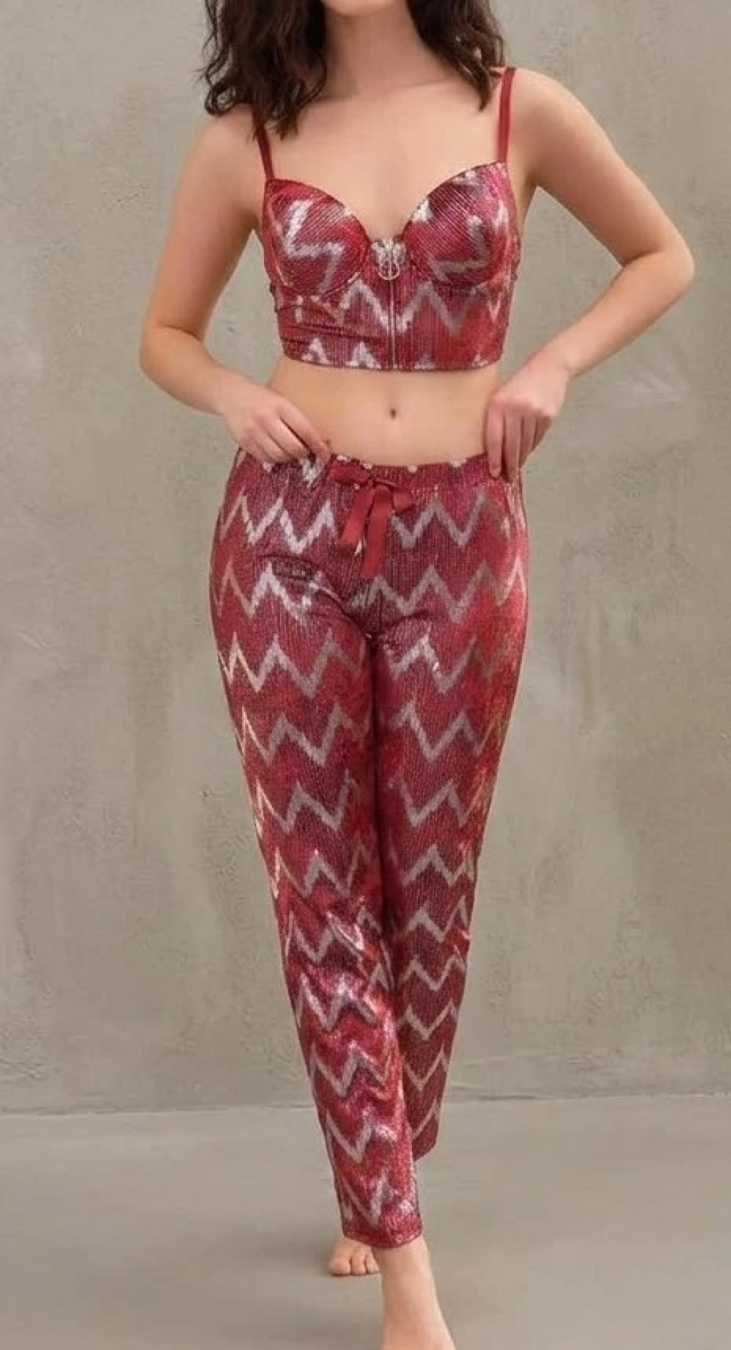 Bu takımın en dikkat çekici özelliği üst parçanın sadece bir pijama değil, balenli, destekli ve dolgulu bir büstiyer formunda olmasıdır.
