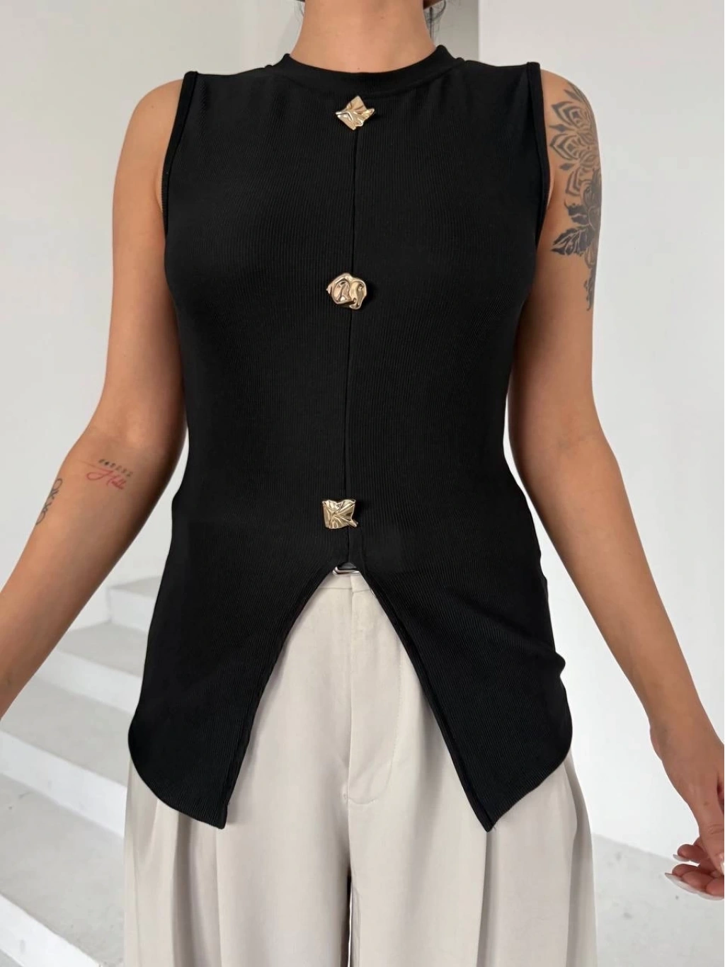 Bisiklet yaka tasarımıyla modern bir hava katan bluz, gold düğmeleriyle de göz alıcı bir detay sunuyor.