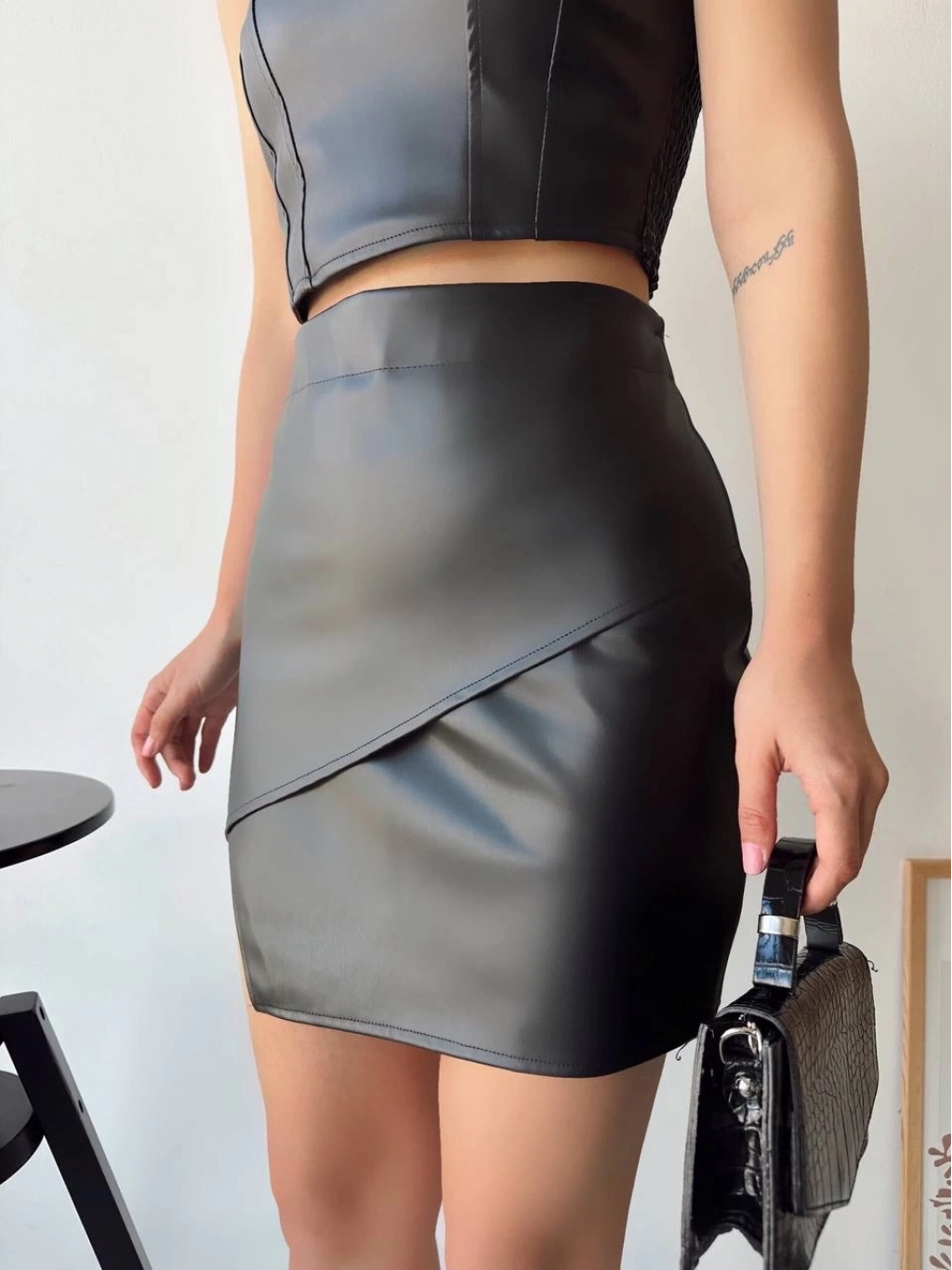 Şıklığı ve tarzı bir arada sunan s240106 kapaklı asimetrik model deri eteğimiz, gardırobunuzun vazgeçilmezi olmaya aday!