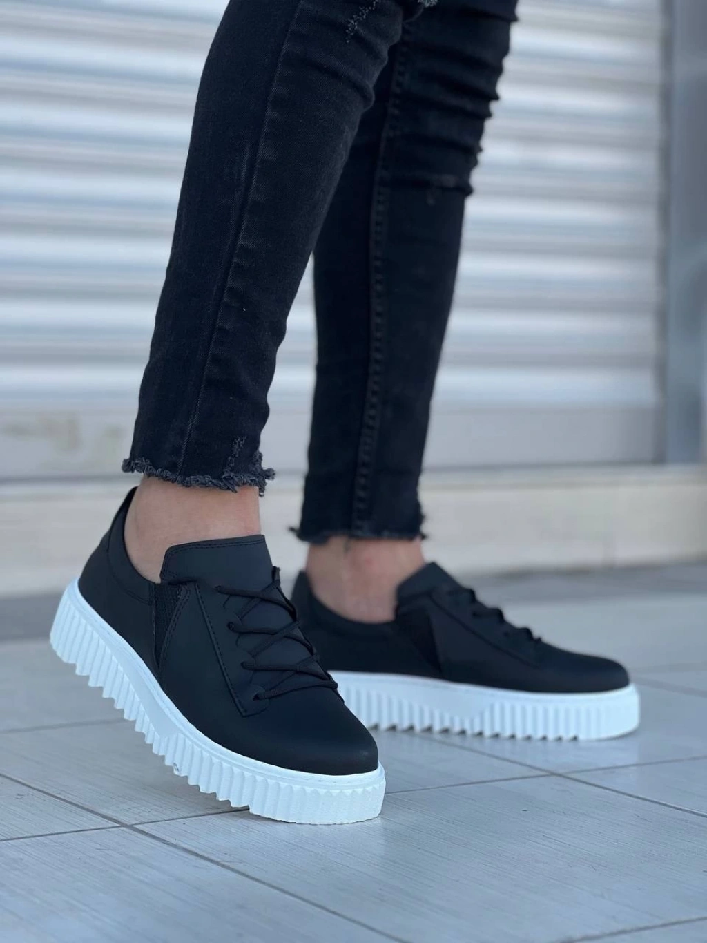 BİÇOMİ KB-X502 Kuback Siyah Cilt Yüksek Beyaz Taban Bağcık Detaylı Lastikli Günlük Erkek Ayakkabı